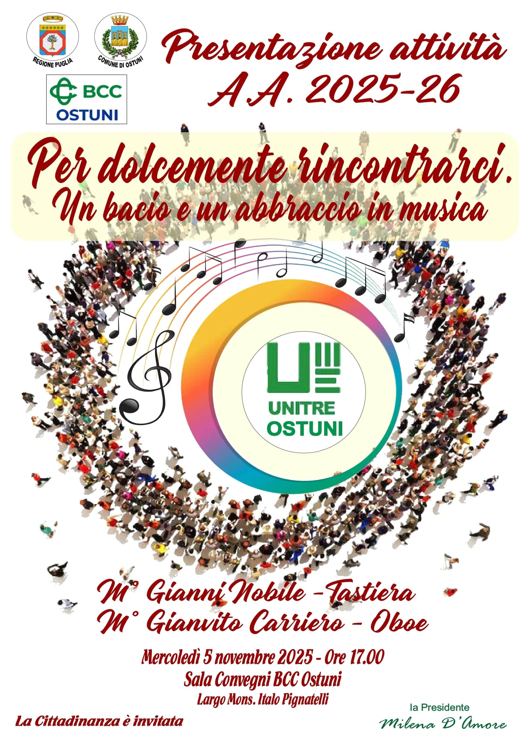 La Banca di Credito Cooperativo di Ostuni ospiterà mercoledì 5 novembre 2025 alle ore 17:00, presso la Sala Convegni di Largo Mons. Italo Pignatelli, la cerimonia di presentazione ufficiale delle attività dell’Università delle Tre Età – UNITRE di Ostuni per l’Anno Accademico 2025/2026, dal titolo “Per dolcemente rincontrarci. Un bacio e un abbraccio in musica”.