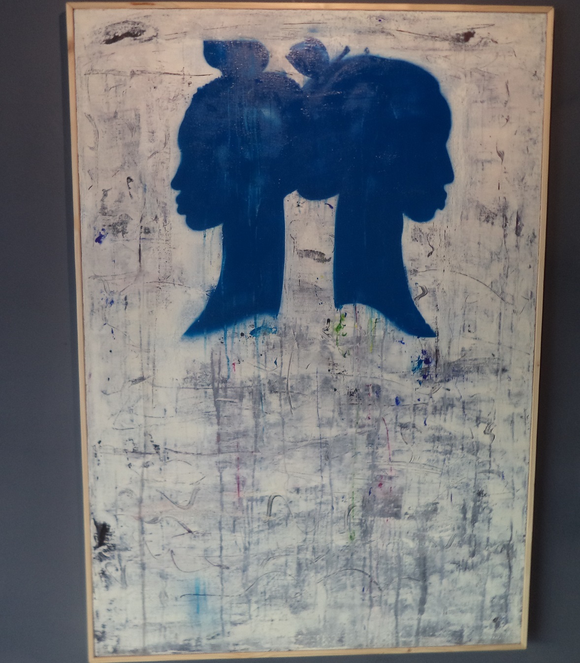 Angelo Colagrossi ha esposto il quadro dal titolo Belle sagome, a tecnica mista. Due teste, prese dal soggetto femminile, sono state rappresentate di profilo, e per una percezione quasi siamese (da un incollaggio alle nuche). Quelle hanno un dinamismo ascensionale, complice il tono azzurro da cielo che “metta le ali” al mero “fantasma” dell’aria. Il titolo del quadro “carica” sulla bellezza, aiutandoci a capire che siamo oltre lo stampo ripetuto del graffitaro, usando lo spray della bomboletta. Sembra che i lineamenti delle due donne alludano ad un’origine africana. Angelo Colagrossi dice d’essere interessato all’evoluzione della forma. In Etiopia si scoprì la femmina d’australopiteco Lucy. Nel quadro, la frammentazione dei vecchi reperti è presente tra i graffiti, i quali avrebbero addirittura un fondale rupestre, per via del tono biancastro.