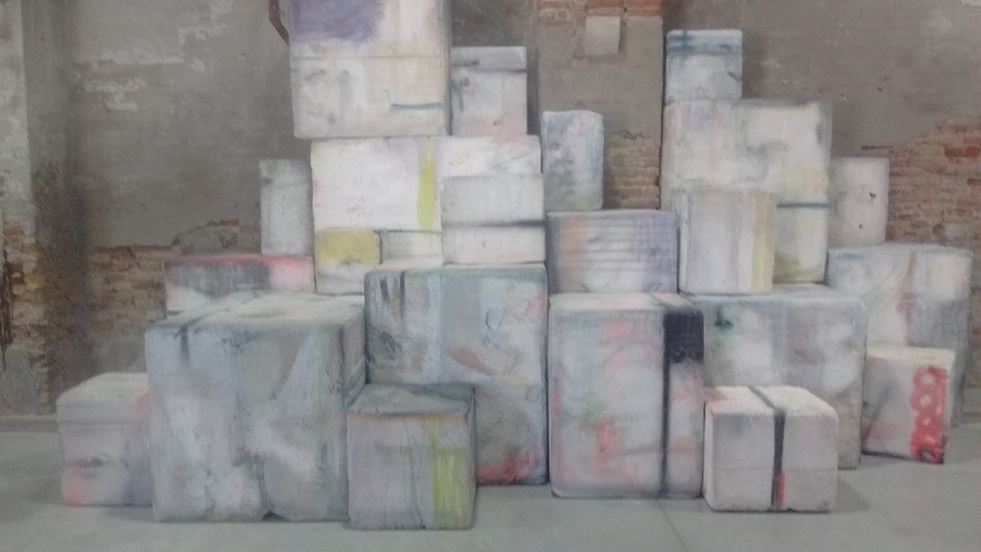 According to poet Ungaretti, the lily of the valley becomes the stem glass of whiteness. That will symbolize the innocence of kids, on the seesaw of sky. Adults lose the initial purity, mainly with their wars. A “toast” to the life by kids positively is not for “a victory”, but “only for fun”. The installation of Eva Rothschild called Spektor shows us a column, virtually having a “meat skewer” of heads. So a human architecture could swing like a bow, gathering the flexibility of its “embraces”. Normally the vacuum suffers the negativity of a shrinkage. There is also its conclusion into a spectre. Something that will lead the “shield” of a corporality to the “goblet” of a transfiguration. A spectre can be perceived “at the sip” of an atmosphere. Eva Rothschild assembles a pseudo-totem over a base in cubes. All the cordiality of the cocktail will not have completely hidden its tension for a consuming… So we will symbolically have to ask ourselves how much the “flexibility” at work could dam a “shrinkage” of the environment. We are good at building some walls between the populations… But in the same time we never “ride” the “rogue waves” for the nature which in latency “empties” the world, with its overheating! The installation of the artist will take the role, that is negatively unknown by us, of a doomsayer as a “bollard spotter” on the unconventional flexibility of the environment. The white tone, mixed to the grey tone, does not guarantee a great purity.