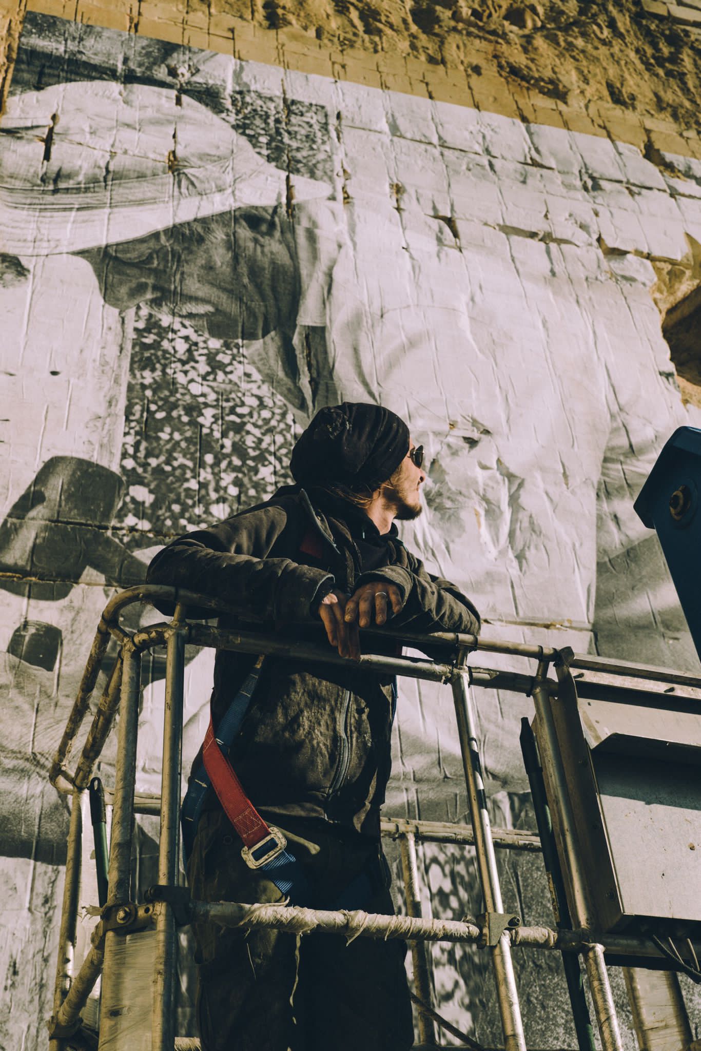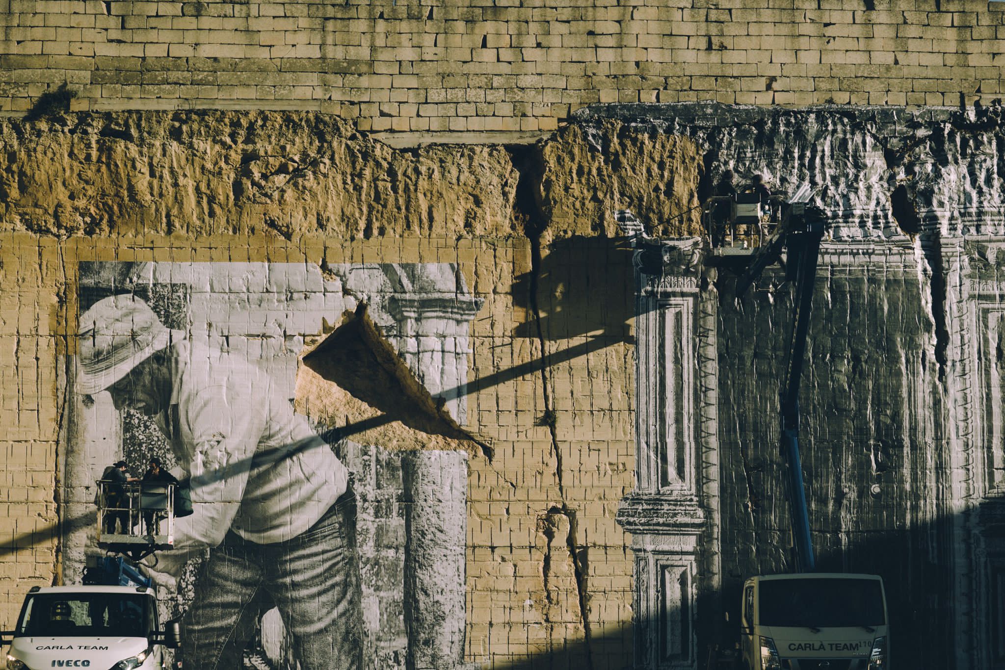 Il murales di Alessandro Tricarico rende omaggio all’importanza della pietra, elemento fondante di un’intera comunità e ruota, a livello tematico, sul rapporto tra le architetture in pietra, caratteristiche dei vicoli del piccolo centro, e l’uomo, abitante-lavoratore. L’opera inscena un’ideale restituzione al territorio della pietra, sottratta attraverso la pratica della cavatura, agendo sul dualismo vuoto/pieno, negativo/positivo che caratterizza storicamente il paesaggio delle cave. Un lavoro intenso che testimonia come la pietra sia ancora oggi elemento fondante di una comunità che costruisce la propria identità e la propria ritualità quotidiana intorno alle cave, con tutte le loro contraddizioni tra opportunità e insostenibilità.