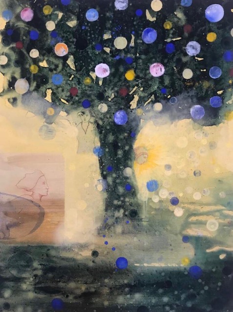 La tecnica risale agli anni Ottanta, all’inizio del mio soggiorno romano. Amo molto la carta e fin da allora iniziai ad incollare dei grandi fogli di acquerello e carta giapponese su degli enormi pannelli di legno montati su telai. Mi servivano dei colori “complici” per mettermi all’opera. Iniziai così a lavorare ed a sperimentare i pigmenti naturali “esasperati” dall’acqua, perché per me acqua e pigmenti preservano quelle energie cosmiche e quelle corrispondenze mistiche che sono l’origine, il mezzo e l’intero scopo di tutta la mia arte. Ancora oggi continuo ad utilizzarli: li sento molto affini, intimi. Le trasparenze che riesco, dunque, ad ottenere, mi danno la possibilità di “intra-vedere” gli accadimenti sul fondo della tela e della carta. Così, le immagini più eteree e delicate, gli oggetti dai contorni più fragili che affiorano a fine lavoro, risultano più intensi, più forti. E tutto questo movimento liquido, tutte queste velature ed immagini fluttuanti mi aiutano a mettere ordine nella fase finale per “s-velare” il mistero che c’è in ogni opera.