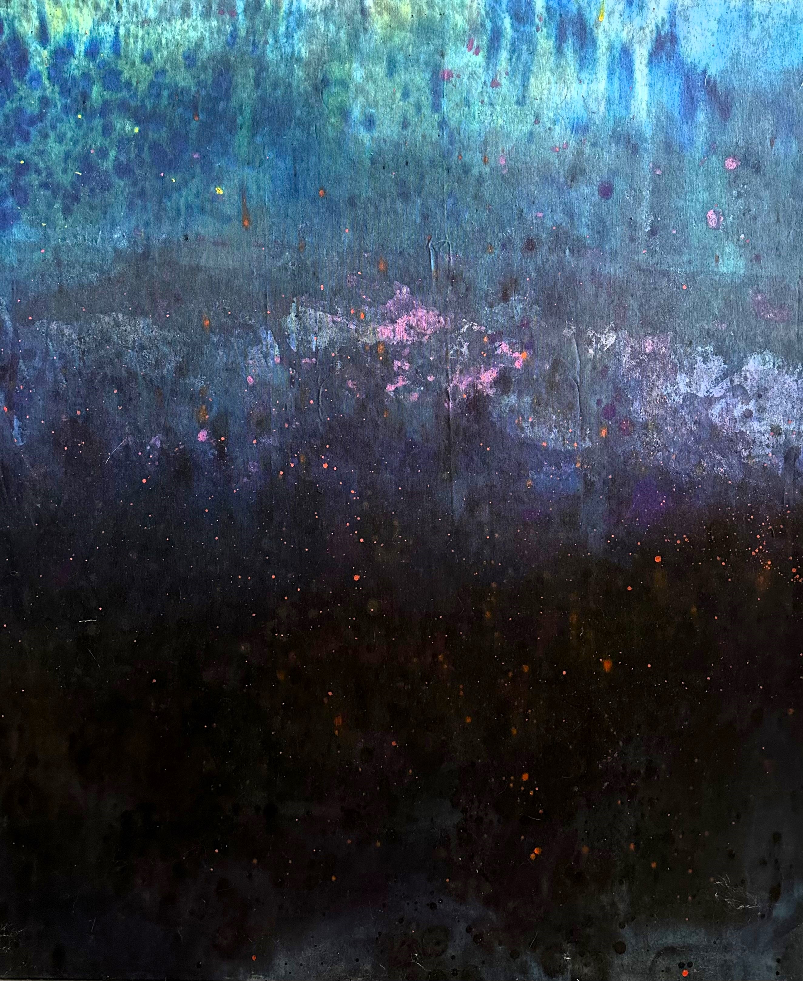 Con la pittura ho cominciato a considerare la luce una “sostanza occulta”, da estrarre dai colori scuri e profondi, rivalutandola nel suo aspetto simbolico. E’ risaputo che la luce sia simbolo universale della divinità. Lo stesso Turner esclamò: il Sole è Dio! E in quest’ottica, attraverso i miei apparenti abissi pittorici, cerco di creare una spazialità indefinita, per certi versi eterea, velatamente spirituale, quindi luminosa.
