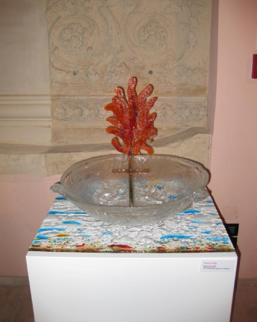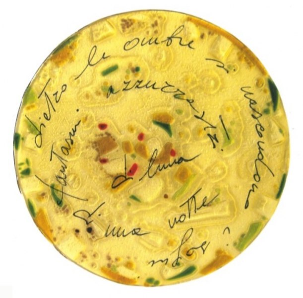 La poesia, quando è vera, è forma d’arte. Nasce da emozioni, sentimenti, convinzioni. Il poeta la esprime, il lettore la fa sua. Può farla sua anche un altro artista coniugandola ad un’altra forma d’arte. Purché con finalità reciprocamente sinergica e mai banalmente strumentale. Poco dopo la scoperta del vetro di Murano, ho imparato a lavorare anche il vetro industriale in fusione nei forni piani elettrici, nelle vetrerie della mia città. Occupandomi di consulenza per la realizzazione di spazi espositivi, trovavo interessante utilizzare questo materiale artisticamente fuso, per inserirlo negli arredi fieristici. Ma la cosa a cui miravo era proprio quella di “umanizzare” le vetrate con l’inserimento di poesie, appunto “sottovetro”, affinchè ne ricevessero un’esaltazione, per così dire, “sotto altra luce”. E, dopo alcune letture sui poeti salentini, ho realizzato, per ogni poesia, il rispettivo ritmo attraverso il colore. Ne è scaturita un’unica opera. Sono nate, così, quattro mostre titolate “Poesie Sottovetro”. E le ampolle in vetro di Murano dal titolo “Sospiri di Vita” sono state quasi sempre presenti nelle mie mostre, come simbolo di vita e di speranza. Di solito in numero di sette, come le note musicali.