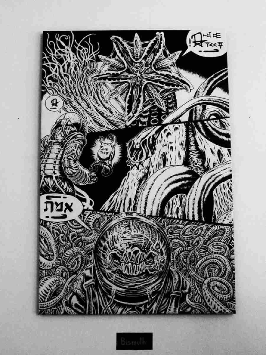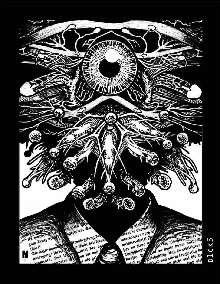 La china su carta intaglia e contorna, lasciando intravvedere le mani di chi è avvezzo a incidere solchi su carne e segni perenni. Furia biomeccanica e stati alterati di coscienza si spostano su piani metafisici tra vegetazione che prende vita e antropomorfismi mutanti; un misticismo più prossimo all’allucinazione di un cyborg, che ad una qualche religione.