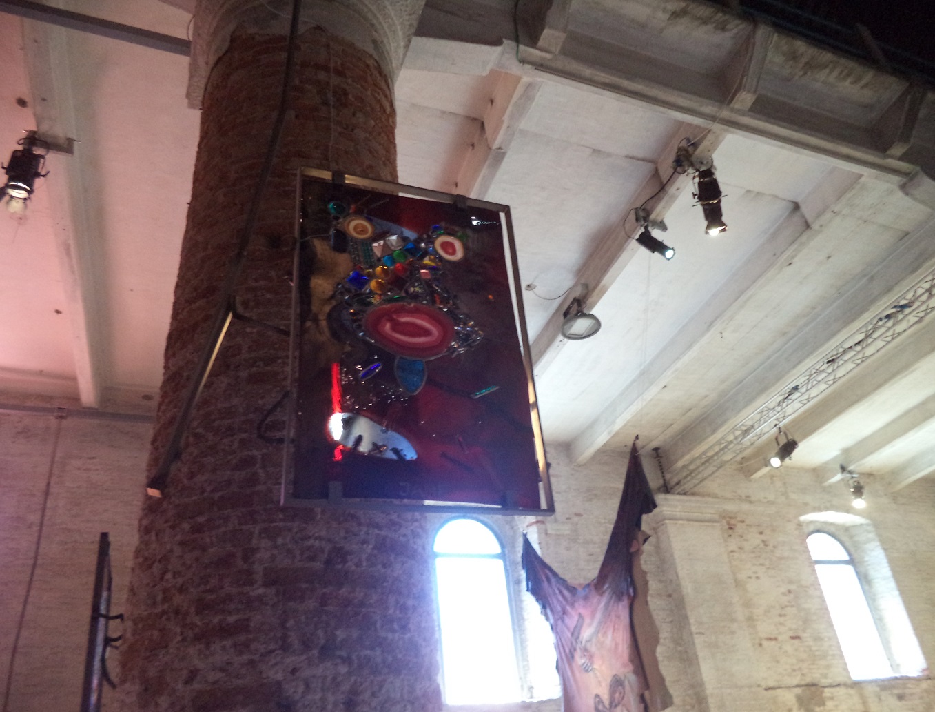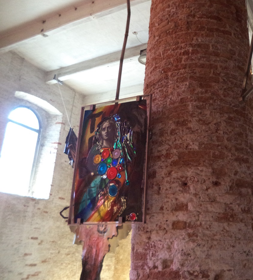 Lungo la colonna dell’Arsenale, è stato appeso pure il quadro a tecnica mista dal titolo Wachter (life is beautifool heiliger Johannes). Esteticamente, quello è impreziosito per la sua funzione di vetrata, più che dalla tipologia di pietre. Sembra che il busto di San Giovanni si regga su una “loggia” di palle da giocoliere. Un festone fungerebbe da aureola, fra i lunghi capelli. L’uso dei colori fosforescenti toglie qualunque spinosità. Immaginiamo che, se i capelli fossero tubolari, allora il principio dei vasi comunicanti subirebbe un “travaso… sparato”: dall’arte del giocoliere (coi cerchi alla base, sul piano orizzontale). Lo sfondo s’elasticizza, in un’atmosfera le cui luci hanno l’arcobaleno addirittura sulla materia terrestre, con le dune. In questa vetrata, il petto virtuale (sotto il realismo della testa), che ovviamente nasconde l’intimità del cuore, “pulsa” con tutta la sazietà delle bolle. Noi siamo sempre assai presi dal nostro sogno.