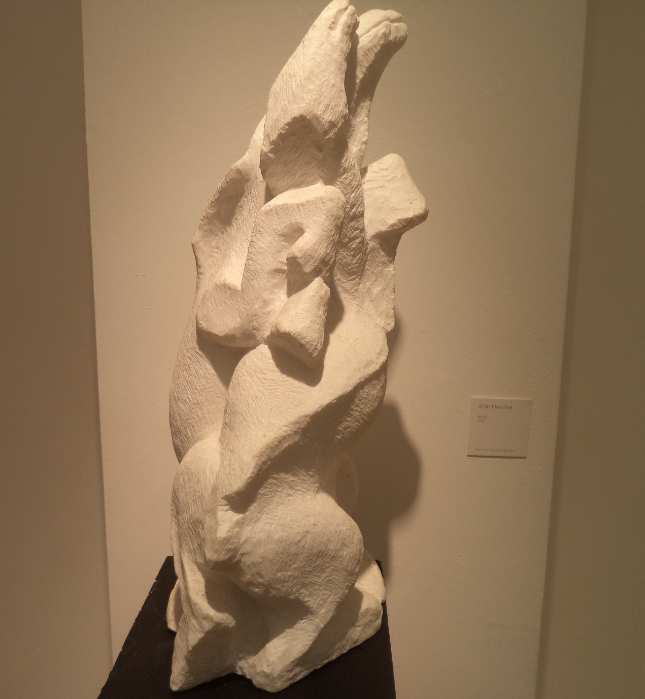 La scultura che s’intitola Nitriti (del 1992) è in marmo bianco statuario. Esteticamente, ci sembra che la sedimentazione della carne si conservi tramite una fertilizzazione sulla spiga. Più che il futurismo sul progresso, vale il vitalismo del rituale. Ci piace immaginare che il corpo umano porti gli abiti medievali. Una processione è “fertilizzante”, partendo dall’animo per arrivare al materialismo. Il cubismo dei profili estemporanei si percepisce continuamente “agganciato” al vitalismo d’un orizzonte. La carnalità gassosa della spiga (che virtualmente rifrange le nuvole assolate, mentre la scultura ha il marmo bianco) vorrà sublimare il resto solido ma inerme delle ossa, in specie se collegassimo la spina alla ferita. I nitriti possono essere pericolosi per la salute umana. Se nella scultura l’abito avesse un cappuccio conico, allora l’agitazione delle braccia per la magia richiederebbe di ferirsi il cuore, da una spada della trachea. Il pensiero si svilupperà in trance.