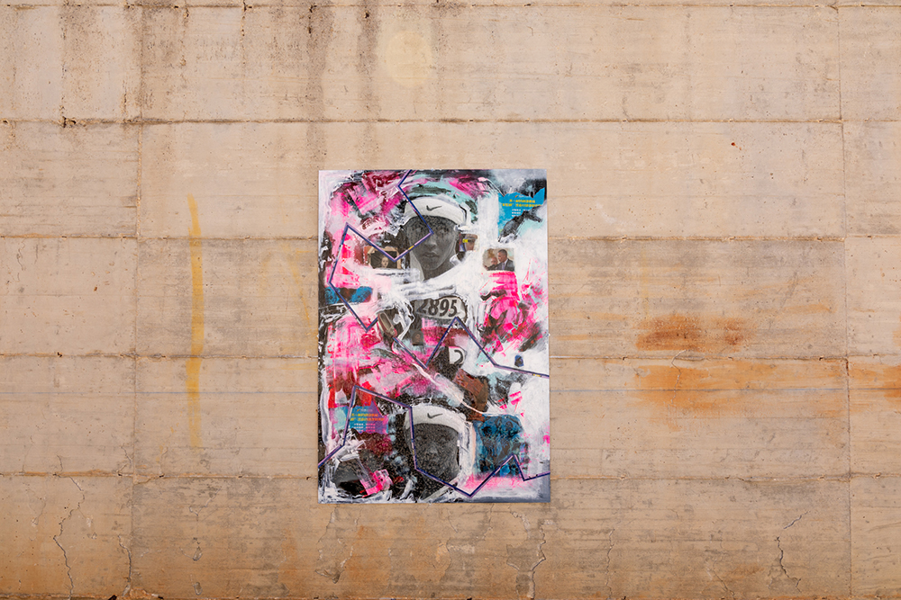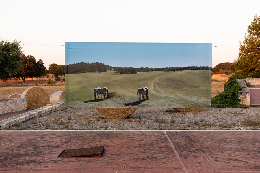 Attraversate la sala, lasciate che il vostro sguardo incontri Wherever, whenever, whatever di Alessandra Cecchini (2023, 358 x158 cm immagine generata da IA su tela gommata) e fatevi condurre all’esterno dalla curiosità di osservarlo da vicino. Alessandra ci inganna. Il suo pensiero parte dall’aspettativa, tradita, di trovare dei cavalli nei grandi campi che circondano l’Hotel, e così lascia che un’intelligenza artificiale generi quel paesaggio immagina- rio. La vostra visione è bloccata ma allo stesso tempo ampliata da questo “luogo qualsiasi, ovunque, in qualsiasi momento”, l’immagine del luogo si rivela quindi determinata da chi lo attraversa, polisemica e instabile nel tempo.
