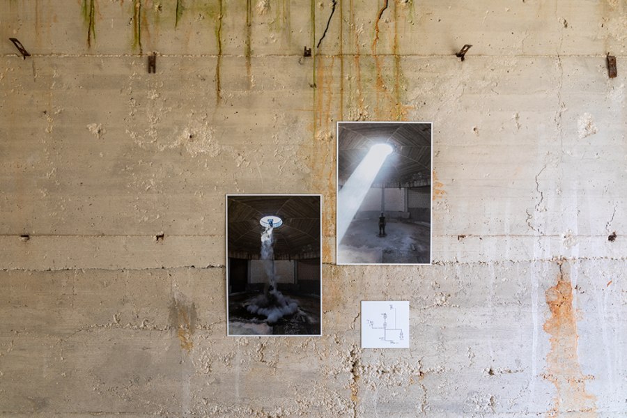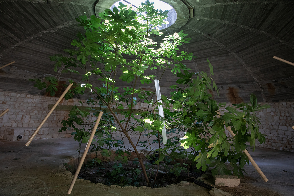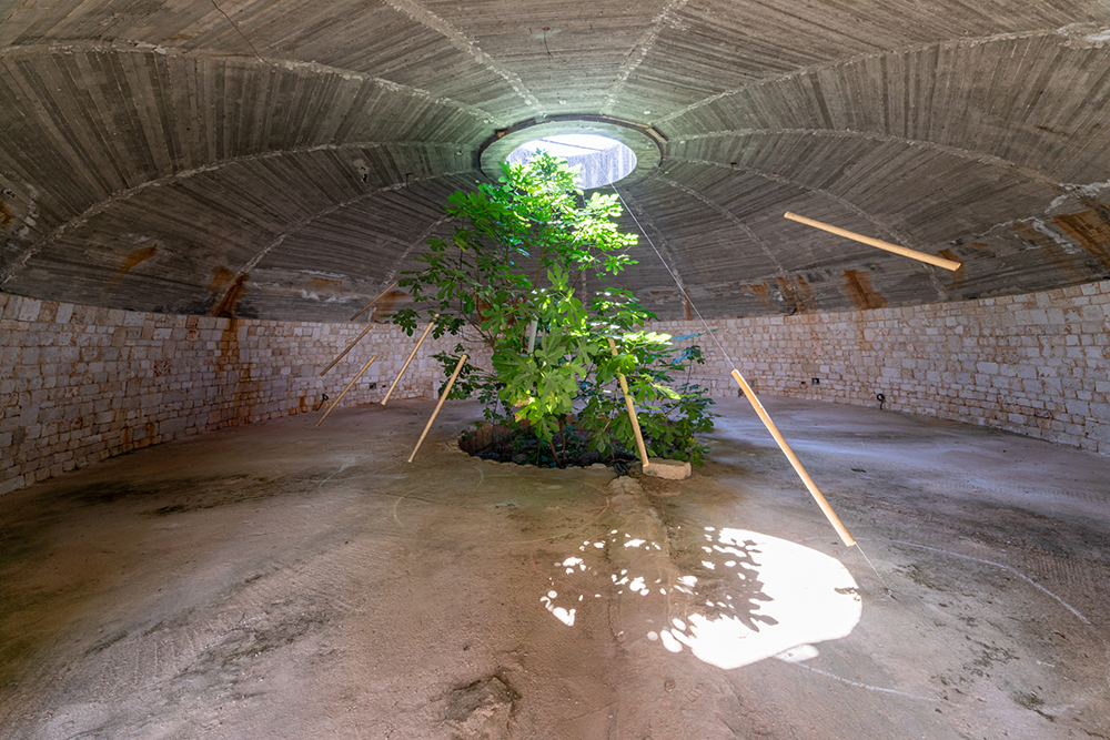 Seguite la discesa del lungo corridoio e troverete Spezzare il tetto della casa (2023 AZIONE: cenere del focolare di casa, corda vegetale, INSTALLAZIONE dim. variabili mixed media) il santuario che Giuseppe Mongiello ha dedicato all’ineluttabilità del passare del tempo, testimonianza di un’azione e memoria del luogo, un camper, che ha sentito suo per molti anni. Ciò che dura si indebolisce, non si può riparare. Fato e Intenzione annientano, periodicamente, le cose. Continuando, fino alla ingresso di un sonoro ipogeo sarete accompagnati dall’intervento murario di Roberto Orlando, Gli alberi crescono mentre l’erba secca vicino al muro (2023, 27 x 3,50 m pittura parietale smalto all’acqua su muro, acrilico su tela di cotone occhiellata) che lungo la parete cadenzata da una cornice ritmica e quasi barocca di colonne e rappresentazioni botaniche sperimenta sul mutamento mettendo in scena i luoghi sentiti e vissuti durante la residenza, rendendo ambigue le forme, su una superficie che inevitabilmente sparirà durante i lavori in corso. Gli inserti policromatici sono effimeri: idee, aspirazioni e futuri possibili dei luoghi esplorati. Ciò che resta è la memoria. Ora voltatevi, avvicinatevi alla soglia di un sonoro spazio ipogeo. Troverete Matteo Costanzo, che con #epicfail_statement 02 [Samia Yusuf Omar] (2023 140x96 cm mixed media su forex) , un tributo all’olimpionica somala morta cercando di attraversare il Mediterraneo dalla Libia, ci mostra un altro aspetto della percezione individuale del tempo: la fascinazione per il fallimento e per la sconfitta che diventa fretta, estetica ed estatica, una spinta a non fermarsi per raggiungere una più profonda consapevolezza di sé. Lasciatevi attrarre da un grande fico che cerca la luce. In questo spazio ieratico sarete accolti dall’installazione di Flavia Carolina D’Alessandro, Benben con Zenit relativo (2023, dim variabili, 8 elementi, spolvero su carta arrotolata, 1 elemento, foratura su carta da lucido, Ø 7x150 cm ognuno). La sua ricerca, sullo scorrere circolare del tempo in questa cupola sotterranea richiama proprio il mito egizio del Benben, la prima pietra emersa dal Caos, il raggio solare solidificato. La consapevolezza dello scorrere del Tempo, una volta nascita della coscienza umana e opportunità scultorea, con Flavia diventa possibilità di conoscere e mappare un luogo nuovo e farlo proprio tramite la luce. Sul fondo della sala, tra l’eco dei passi, troverete La tentazione di esistere (2023, 588 x 28 cm succo di erbe spontanee su lino, 16x11,5cm 100 buste succo di erbe spontanee su lino) di Serena Grassi, che affronta lo scorrere ineluttabile del Tempo. Serena utilizza materiale organico recuperato in situ per una riflessione sullo sparire e sulle tracce che si lasciano dietro di sé. Parte centrale del lavoro è l’offerta al visitatore di seguire il proprio ritmo interiore, di avere potere sul proprio Tempo. Prendete una busta, scegliete con cura. Buona deriva.