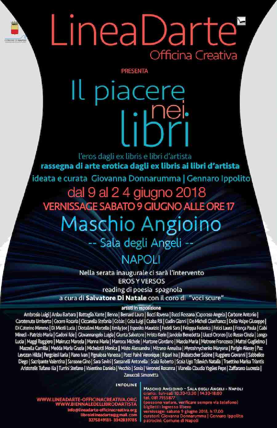 Sabato 9 giugno alle ore 17 presso la sala degli Angeli del Maschio Angioino Inaugura “Il piacere nei libri” rassegna di arte erotica dagli ex libris ai libri d’artista. La kermesse è curata e ideata da Gennaro Ippolito e Giovanna Donnarumma, promossa da Lineadarte Officina Creativa in collaborazione con il Comune di Napoli. La mostra si snoderà su un percorso poetico visivo di oltre settanta opere tra ex libris e libri d’artista tra autori nazionali ed internazionali, con un riflettore sempre ben puntato sugli artisti napoletani.