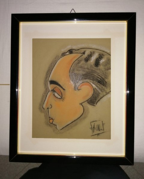 Dopo 82 anni è stata ritrovata per caso in una soffitta di una casa a Salerno un'opera inedita eseguita nel 1937 da Federico Fellini. In quel periodo i disegni di Federico Fellini che faceva per gioco ritraendo i compagni e gli insegnanti del liceo e che poi regalava agli amici erano apprezzati al momento e quasi sempre buttati via. L’attuale proprietario dell’opera Luigi C. ci racconta di un suo zio insegnante di ginnastica, suo omonimo, che dopo aver frequentato la Scuola della “Farnesina” meglio conosciuta ufficialmente come "Scuola fascista di educazione fisica", conseguendo il diploma si trovò nel 1937 a insegnare come primo incarico scolastico al liceo ginnasio “Giulio Cesare” di Rimini nella classe dove frequentava anche Federico Fellini. Il nipote ci racconta che “lo zio gli ripeteva spesso di un particolare incontro al bar con il giovane Fellini in pieno inverno del 1937, nel penultimo anno di scuola che Fellini fece a Rimini. Quel giorno il prof. L. C. siccome doveva entrare a scuola alla seconda ora, soleva fare come al solito una passeggiata sul lungomare che in quel periodo era desolato. Camminando notò in un tavolino di un bar un ragazzo che riconobbe nel suo alunno Federico Fellini. A vederlo il giovane Fellini con voce suadente e remissiva gli disse: Professore, dopo una notte di baldoria con gli amici sono stanco ed ho fame, per cortesia mi può offrire un cornetto e un cappuccino che non ho neanche una lira”. Il prof. giusto il tempo di ordinare al bar la colazione al suo alunno si ritrovò sul tavolino una caricatura colorata su carta Bristol; in un attimo il ragazzo di Gambettola aveva abbozzato con segno deciso il ritratto del Prof. regalandoglielo e dicendo: “Professore, a me non mi piace la scuola, lo conservi perché io un giorno sarò un grande”. Lo conferma anche l’attore Alberto Sordi in cui Fellini nei primi anni di vita stentata a Roma soleva spesso dire agli amici “ un giorno sarò un grande regista”. Tale opera di Fellini il Prof. l’ha custodita in casa con gelosa cura per lungo tempo fino alla sua morte (1999). Da sottolineare, visto i suoi studi incerti al Liceo Classico che non andavano per niente bene, nel 1937 Fellini aveva iniziato anche a guadagnare qualcosa seguendo il suo interesse artistico, infatti, in quell’anno insieme al pittore Demos Bonini, aveva aperto la bottega “Febo” dove i villeggianti andavano a farsi immortalare in azzeccate caricature firmate “FEBO”, con il giovane Fellini che disegnava e Demos Bonini, essendo un pittore li colorava. Di quegli anni lo stesso Fellini ha raccontato alla Chandler (Io, Federico Fellini, A. Mondadori, 1995) questa sua precoce vocazione: “La scuola mi offriva l’opportunità di disegnare con la scusa di prendere appunti o di scrivere e quindi di vivere nel mio mondo di fantasia, mentre fingevo di ascoltare le parole degli insegnanti. Disegnavo di nascosto caricature, sperando di non essere mai scoperto e che tutti pensassero che stavo prendendo appunti su appunti”. Una passione intensa quella di descrivere le facce e le espressioni grottesche, degli amici che diventerà poi una delle caratteristiche peculiari del suo cinema. In effetti, Marcello Monaldi ci dice che “Fellini ha sempre disegnato accanitamente: da bambino, quando riempiva le tovaglie di casa con interminabili ghirigori, da studente, quando faceva le caricature degli insegnanti o andava sulla spiaggia di Rimini, vestito di tutto punto, a caccia di clienti a cui fare il ritratto, da giovane in cerca di fortuna quando collaborava come umorista e vignettista al Marc’ Aurelio: e poi da regista, quando il disegno gli serviva per fissare i lineamenti di un personaggio, per abbozzare un costume, una scenografia per captare le suggestioni cromatiche da…”. Proprio nel 37’ tanti bozzetti che Fellini produceva per pochi centesimi sul lungomare di Rimini quasi sempre venivano buttati subito via perché ritenuti di poco conto. Proprio in quegli anni inizia a collaborare con alcune riviste inviando vignette sino a diventare un collaboratore fisso del settimanale fiorentino “420” e poi del “Marc’Aurelio”: siamo ormai nel 1939 anno nel quale Fellini si trasferisce a Roma con la scusa di iscriversi a giurisprudenza. Comincia a frequentare l’ambiente dell’avanspettacolo e della radio, a scrivere copioni, gag e battute per spettacoli e film vari. Nasce un mito della cinematografia. Purtroppo, tanti lavori di quegli anni riminesi sono stati persi e si conosce pochissimo questa parentesi giovanile che precede l'arrivo a Roma nel 1939 con l'inizio geniale nel campi della cinematografia a contatto con importanti personaggi del cinema e dello spettacolo. Infatti, si conoscono maggiormente i disegni degli anni 50 fino agli anni 80 legati al cinema, ma rimane poco conosciuta la parentesi degli anni di Rimini. L'opera in questione analizzata e periziata dal critico d’arte Sandro Bongiani della Collezione Bongiani Art Museum di Salerno si presenta protetta da una vecchia cornice nera dal bordo oro con vetro e relativo passepartout. Disegnata a pastelli su Carta Bristol di cm 25x35 nel 1937 con una tecnica già matura nonostante i suoi 17 anni. L’opera risulta di grande importanza, soprattutto, per capire la personalità geniale del giovane Fellini. E’ di sicuro una delle poche o forse l’unica opera firmata dal grande regista, (la firma di Fellini è visibile dentro un piccolo quadrato inclinato in basso a destra del foglio), di fatto risulta una delle prime opere giovanili già convincenti e geniali del maestro. Oggi quest’opera inedita è valutabile tra i 50 e i 70 mila euro. Sandro Bongiani