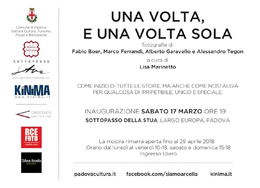 Fabio Boer, Marco Ferrandi, Alberto Garavello e Alessandro Tegon, nel loro progetto artistico - fotografico Sìamo Arcella, hanno scelto un luogo ad alta e caleidoscopica concentrazione umana, il quartiere padovano Arcella, per raccontare storie, persone, vissuti, attimi sospesi. In questo luogo denso di persone, connessioni e movimenti, dove tutto appare indistinto, confuso e sfuocato, ogni esistenza umana resta unica e speciale negli scatti raccolti in “Una volta, e una volta sola”.