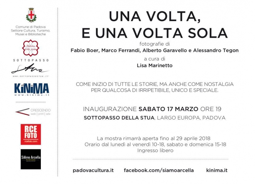 UNA VOLTA, E UNA VOLTA SOLA di Fabio Boer, Marco Ferrandi, Alberto Garavello e Alessandro Tegon, curata da Lisa Marinetto, verrà inaugurata sabato 17 marzo ore 19.00 negli spazi espositivi del Sottopasso della Stua a Padova e resterà aperta al pubblico fino all’29 Aprile.