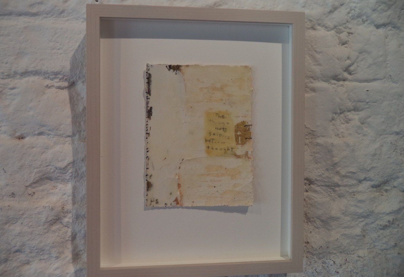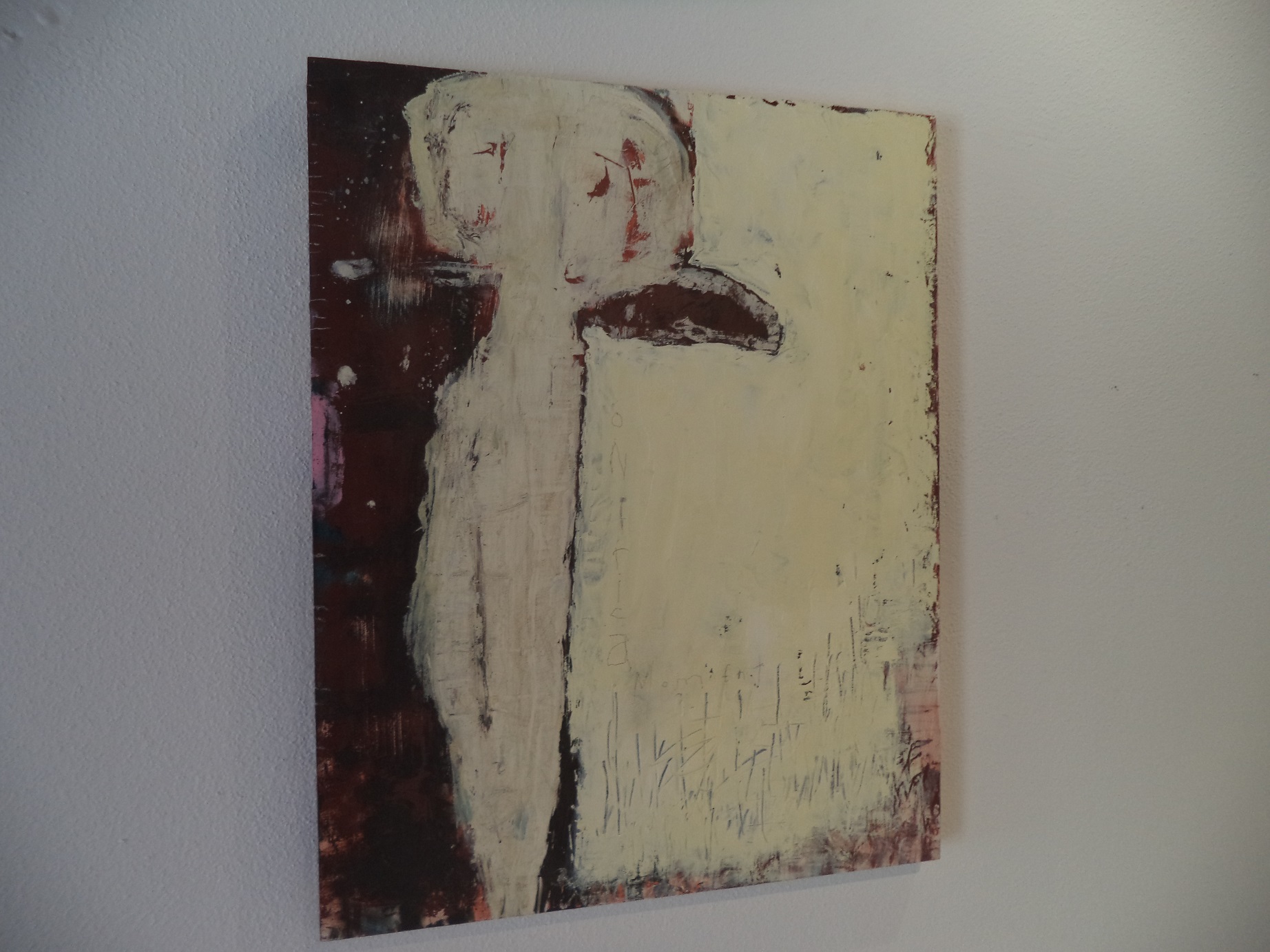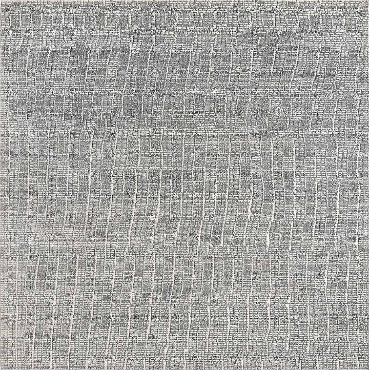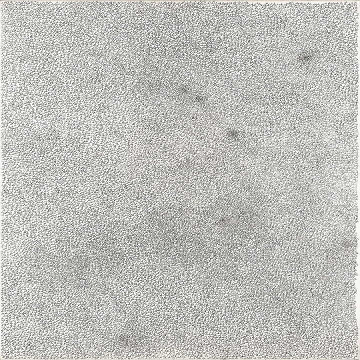 A Venezia, Gary Gissler ha portato i suoi quadri d’arte concettuale. La superficie può percepirsi corticale, o comunque rugosa. Il segno ondeggiante delle parole “cifrate” in corsivo è sovraccaricato. Ci sembra che l’artista abbia usato la spillatrice, oppure un timbro… Qualcosa che virtualmente contraddirebbe la grigia fievolezza della grafite. Grazie al carattere del corsivo, l’impulso a cavalcare l’orizzonte “misterico” oltre il quadro preferisce defilarsi, ed all’interno del segno. Il parolibero “pompatissimo” del futurismo potrebbe frenare, da una “luce” trascendentale. Il tratto ondeggiante deriverebbe da un tropismo misterico. Immaginiamo un vento di sabbia, che sentimentalmente copra la “rumorosità” del cervello troppo pensante. I toni freddi del biancastro e del grigiastro avrebbero la “luminosità” contorta del respiro. Il vento di sabbia sarebbe indirizzato al “tratto meteorologico” d’una banderuola. In un quadro, sembra che le parole abbiano “parcheggiato”, e seguendo le apposite strisce sull’asfalto. Così, emergerà la percezione rallentata d’una “benda” oracolare. Col testo ermeticamente cingolato al tratto, sulla “rumorosità” della comprensione calerà la dissolvenza della memoria. E’ noto che le persone possono soffrire di calcolosi… Fortunatamente, nella salute del quadro, l’impulso elettrizzante della sinapsi cerebrale cederà alla “nebulosa” anestetizzata del sogno. I toni freddi del biancastro e del grigiastro impedirebbero una decomposizione del quadro. Essenzialmente a Gary Gissler interessa il perturbante della comunicabilità. C’è un quadro dallo sfondo rosso; ma la sua passionalità si concentra sui tratti che si fanno un’interferenza oracolare. Chi scrive si facilita il ricordo; a volte lo “romanzerà” mediante la fievolezza della grafite…