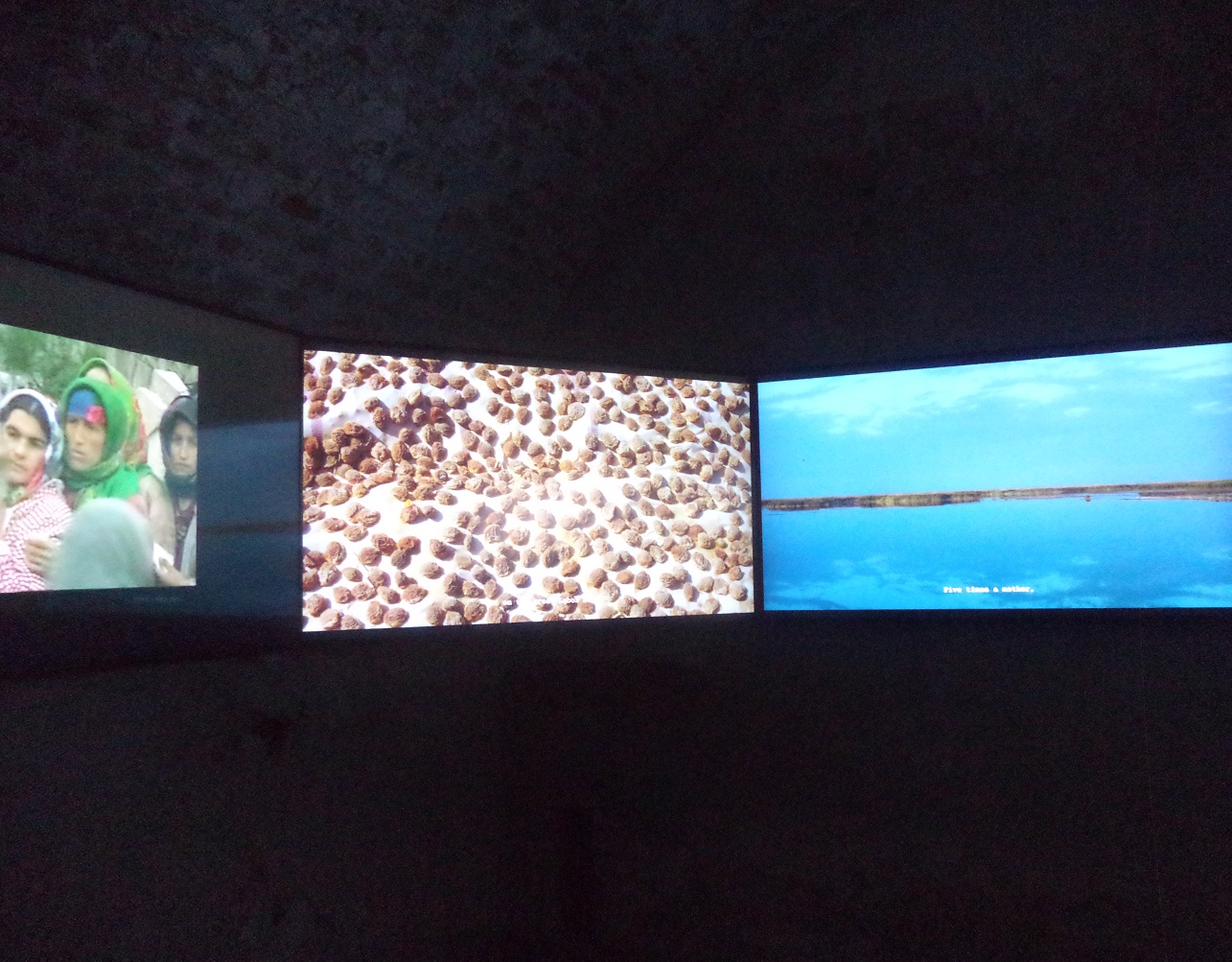 A Venezia, lei installa sette monitor, provando a far ondeggiare il corso “appena cronachistico” del viaggio. Simbolicamente, questo sarebbe lo sforzo d’un ricordo, contro i conflitti politici che hanno strumentalizzato, per nazionalismo settario, l’identità: dalla “bandiera” alla “paratia”. L’artista invita al passaggio da una “secchezza” per lo sballottamento ad una “freschezza” per la fluidità. Contro l’incanalamento per < direttissima > da un opportunismo privato, forse si potrà preferire il melting pot senza una “disseccazione” nel < pensiero unico >? Le bandiere non si fissano per l’ingenuità del nazionalismo. Esse sono mosse dall’universalità del vento. Ritorna così una spirale percettiva, grazie all’atmosferologia. Nazira Karimi prova ad aumentare la portata d’acqua: non solo per i fiumi, bensì per gli stessi sentieri. E’ vivificato emotivamente il ricordo per lo sfollamento imposto, affinché le generazioni future capiscano d’evitarlo. L’astrattezza per la folata di vento si materializzerebbe alla propria spirale attraverso una calamita. Non c’entra soltanto lo stelo erboso, dalla steppa. A Venezia, l’allestimento dei sette monitor appare a ferro di cavallo. Sopra c’è la volta a botte per una vecchia cantina, compresa nel Giardino delle Vergini. I ricordi s’aggrovigliano sempre, potendo al massimo riecheggiare. L’artista ha montato la sequenza “oscillante” del documentario con le varie storie in sovrapposizione, garantendo la linearità impercettibile del verso persiano: da destra a sinistra (alla “distorsione” per quello degli Occidentali). Chissà se il ritorno dell’acqua farà ondeggiare anche i pescherecci rovinati dalla ruggine, sul Lago d’Aral… Esiste la “canalizzazione” del cordone ombelicale, il cui prosciugamento tuttavia aiuta la vita. Nazira Karimi lo vorrebbe ricucire, per la sua genealogia. Riprendendo l’acqua, le scritte in sovrimpressione aggiungeranno lo scroscio al flusso, esattamente come accade per la poesia, all’interno del linguaggio quotidiano. Terminata una guerra (P.S. si spera il prima possibile!), s’assiste ad un fenomeno “ambiguamente positivo” di rimpatrio, che appartiene ai recuperanti. Loro avranno la “spirale” del metal detector. Se lo citiamo, è a causa delle navi arenate al Lago d’Aral, sulle quali si finanzia (sia in Kazakistan sia in Uzbekistan) un turismo dal fascino un po’ lugubre. In Medio Oriente, il Mar Morto vanta una salinità talmente elevata da indurre il bagnante giocoforza a galleggiare. Ci piace immaginare che Nazira Karimi se potesse, volentieri camminerebbe sul Syr Darya natio. Lei non viaggia da turista, e nemmeno da recuperante. Il Syr Darya è diventato < il > cammino della vita per un’intera famiglia, da molte generazioni.