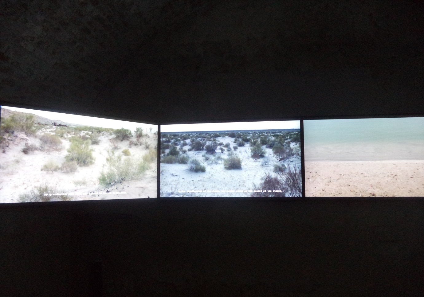In Venice, she installs seven monitors, trying to allow a fluctuation for the course “only for a chronicle” of the travel. Symbolically, this would be the effort of remembering, against the political conflicts which instrumentalized the identity, for a sectarian nationalism: from the “flag” to the “bulkhead”. The artist invites to a passage from the “dryness” for a tossing and turning to the “freshness” for a fluidity. Against the channelling for the < most direct route > from a private opportunism, perhaps could we prefer the melting pot without a “desiccation” in the < one-sided thinking >? The flags are not fastened for the ingenuousness of a nationalism. Those are moved by the universality of the wind. So a perceptual spiral returns, through an atmospherology. Nazira Karimi tries to increase the water flow rate: not only for the rivers, but also for the “decisive” paths. The memory of the imposed evacuation is enlivened emotionally, in order that the future generations understand its refusal. The abstractness for the gust of wind would be materialized at the own spiral through a magnet. About this, the blade of grass from the steppe is not the only cause. In Venice, the setup of the seven monitors appears in a horseshoe. Above there is the barrel vault for an old cellar, included in the Giardino delle Vergini. The memories always become tangled, able if anything to echo. The artist edited the “swaying” sequence of the documentary with the different tales in overlap, guaranteeing the imperceptible linearity of a Persian line: from right to left (for a “distortion” of the Occidental line). Who knows if the return of the water will allow also the fishing boats, ruined by the rust on the Aral Sea, to fluctuate… A “canalization” for the umbilical cord exists; however its draining helps the life. Nazira Karimi would want to resew that, for her genealogy. Filming the water, the writing overlay will add to the flow a roar, exactly as it happens for the poetry, inside the everyday language. After the conclusion of a war (P.S. we hope as soon as possible!), we are witnessing the phenomenon “ambiguously positive” of a repatriation, which belongs to the scavengers. They will have the “spiral” of a metal detector. We mention this because of the ships beached on the Aral Sea, for which a tourism with a charm a bit lugubrious is financed (both in Kazakhstan and in Uzbekistan). In the Middle East, the Dead Sea praises a salinity so much high that this induces the swimmer inevitably to float. We like imagining that Nazira Karimi gladly would walk on the native Syr Darya, if she could. She does not travel for tourism, and neither as a scavenger. The Syr Darya is become < the > path of life for an entire family, for several generations.