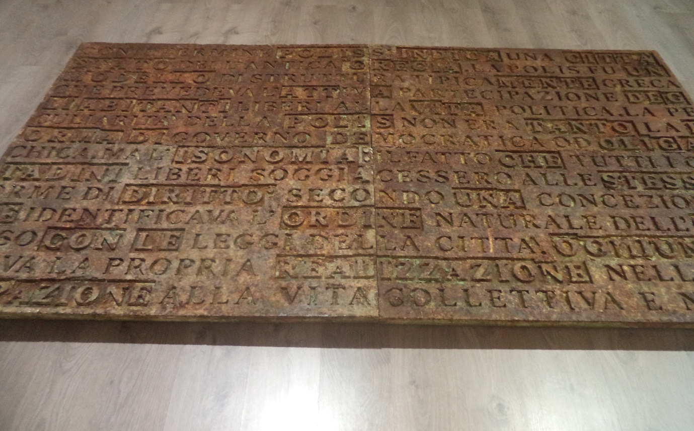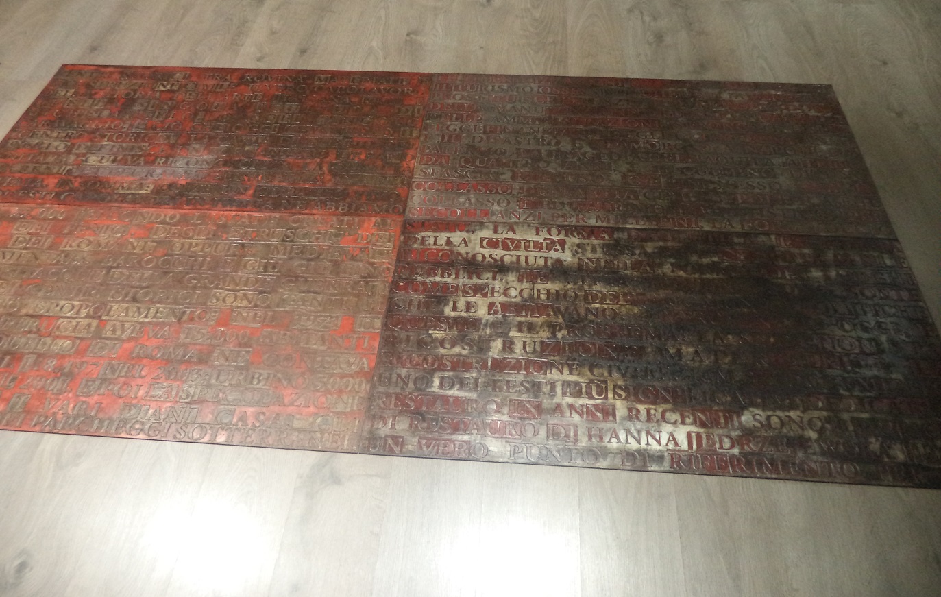 Per Andrej Tarkovskij, esteticamente il regista deve togliere il superfluo, che “blocca” distraendo, al fine d’arricchire l’immortalabile in lunghezza. Il coinvolgimento dello spettatore è “di rincorsa” tra i fotogrammi, ed in un vissuto (caro alla fenomenologia). Per Gillo Dorfles, nella preistoria l’horror vacui indusse l’uomo a coprire di disegni le caverne. Di contro modernamente, al “bombardamento” continuo dei segni (con l’interesse subliminale del mercato o della politica), bisognerebbe caldeggiare un horror pleni. Si godrà la ricerca d’uno stacco, per un riposo che al massimo critichi con la reinterpretazione. Franco Del Zotto Odorico cerca una dialettica fra l’ologramma ed il bassorilievo, confondendo le tonalità del fondo rispetto al flusso comprensivo delle parole. Vi si percepirà il paradosso d’una durezza “psichedelica” (dalla luce “mattonata”, che potrà ricordare la dipendenza tipicamente contemporanea dal touch screen, pure nelle relazioni sociali). Le installazioni hanno testi ricavati da libri diversi (di storia, di filosofia, di poesia ecc…), dove conta molto la trasmissione etica d’un messaggio. Lo spillo galleggiante nell’olio, od il normografo se non per l’arcobaleno sul metallo almeno per il banco di nebbia sul marmo, simbolicamente indagano la persistenza del Verbo. La vita trapasserà nella morte; al di là della religione e del laicismo vale una “condanna” a lasciare una “traccia” di sé. Così per l’uomo preistorico una caverna incuteva timore avendo il buio duro (dalla pietra), anziché il buio fluido (dal cielo, le cui stelle permettevano l’orientamento). Nella simbologia cristiana, l’olio (dallo Spirito Santo) dà vigore alle membra “lapidate” dal peccato originale. Addirittura al Messia s’associa l’etimologia dell’unto. Questo permette al corpo di galleggiare nella vita immortale, nonostante le ferite della croce che, limitatamente agli uomini, deriverebbero dagli impulsi ad “impalarsi” sui beni materialistici (menzionando gli spilli). In un’altra installazione, virtualmente un tappeto in rotolo riuscirà a “sgommare” grazie al flash delle lettere, sia in rilievo sia in scavo. Sarà una sublimazione laica per il “motore” trinitario della spiritualità religiosa: fra Dio, Cristo e lo Spirito Santo. Questo determina il “mistero” d’una ricombinazione. A resistere contro i “graffi” della vita, nella quotidianità, sarà “l’arcobaleno” del nostro corpo: sull’unghia (dal preciso titolo dell’installazione), tramite cui noi desidereremo di conquistare perfino un muro di pietra (dall’arrampicata all’abbattimento). Franco Del Zotto Odorico seleziona testi che trattano la caducità dell’uomo, in chiave sociale. Tutto questo è anche attualizzabile; ad esempio in natura l’olio può inquinare, mentre il cemento può soverchiare. L’installazione con gli spilli ci ricorda il motto cristiano per cui più facilmente il cammello passerà dalla cruna d’un ago, rispetto al ricco verso il Regno di Dio.