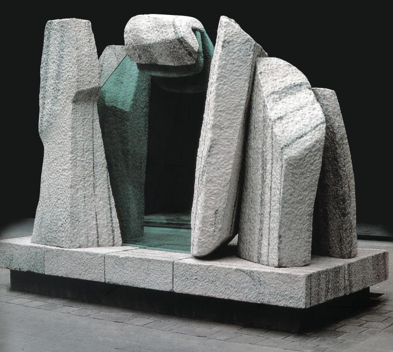 In una scultura dal titolo Bisanzio (1992), le pietre si differenziano anche dalla colorazione. Tutti gli incastri orientaleggianti ma piatti per apparizione teorica, dal tangram e dal tao, si sarebbero ormai occidentalizzati alla prassi d’una rimodularità. Ce lo esemplificherà lo stivale col tacco, o la coppa del torneo calcistico… Il loro peso non è mai ingombrante, giacché affascina assai il progetto di portarlo. Ma, quando il pendio scende dolcemente verso il lago, forse coerentemente si preferirà un recupero della “vanga”? Il suggerimento di curare un giardino, senza per questo rifiutare a priori un disordine del bosco, rimane orientale. La casa-atelier di Giancarlo Sangregorio fu costruita sotto l’ispirazione di Alvar Aalto, integrando il razionalismo sul naturalismo. Bisanzio aveva rappresentato per secoli un passaggio obbligato, fra l’Est (“caldo”) e l’Ovest (“freddo”). Questo era protetto da mura veramente potenti. Lungo i castelli si camminava lavorando, per la guardiania. Tutti noi preferiremmo sublimare artisticamente i crolli degli imperi grazie ai massi erratici, per l’innocenza della loro inorganicità. Ma purtroppo le cannonate ci rendono spettatori passivi. Lo sport moderno rende la competitività più spensierata, mentre noi immaginiamo che una parte della pietra scolpita appartenga al calciatore. Giancarlo Sangregorio andò a studiare l’arte delle culture esotiche, od animistiche (in Africa ed in Oceania).