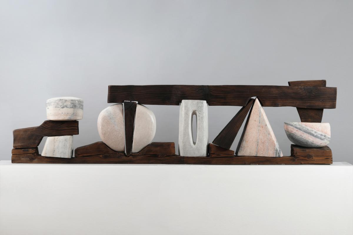 Si consideri l’allestimento che s’intitola Kabale und liebe (1997). Il legno ed il marmo sono stati presi da Ornavasso, nell’Ossola. Vale una “porta d’ingresso” verso le regioni in cui storicamente abita la minoranza germanica dei Walser. Ci pare che l’allestimento sviluppi l’orientamento della meridiana sul sentiero d’una fonte flessibile. Qualcosa di simile accade fra il totem ed i segnali di fumo. Volendo spiritualizzare la caduta massi, realisticamente potrebbero bastarci le intemperie. In alta montagna il clima è variabile. Può intimorirci la perdita dell’orientamento tramite le pareti assolate, col banco di nebbia sopraggiunto perfino in estate. La sorgente d’acqua purissima è agognata, in caso di fatica per la sete. La sua erranza “c’ingelosisce”, rispetto a quella del nostro sentiero. Nell’installazione di Giancarlo Sangregorio, noi percepiamo la miniatura d’un acquedotto impugnato fra le mani, dove la staccionata di protezione manca. Il “rubinetto” d’una fonte rocciosa è sempre altissimo. Le forme più astrattamente geometriche (della sfera, del cilindro e del cono) avranno lo gnomone squarciante, anziché indicante. Il caratteristico luogo della Terra in cui le vertigini si fanno sentire a 360° è l’alta montagna, nonostante il magnetismo della “terrazza”. Il titolo dell’opera vale simbolicamente per gli intrighi d’amore. Per Giancarlo Sangregorio, uno spaccapietre di pianeti sarà necessariamente uno < spaccatemporalità >. Sesto Calende menziona una calendarizzazione storica.