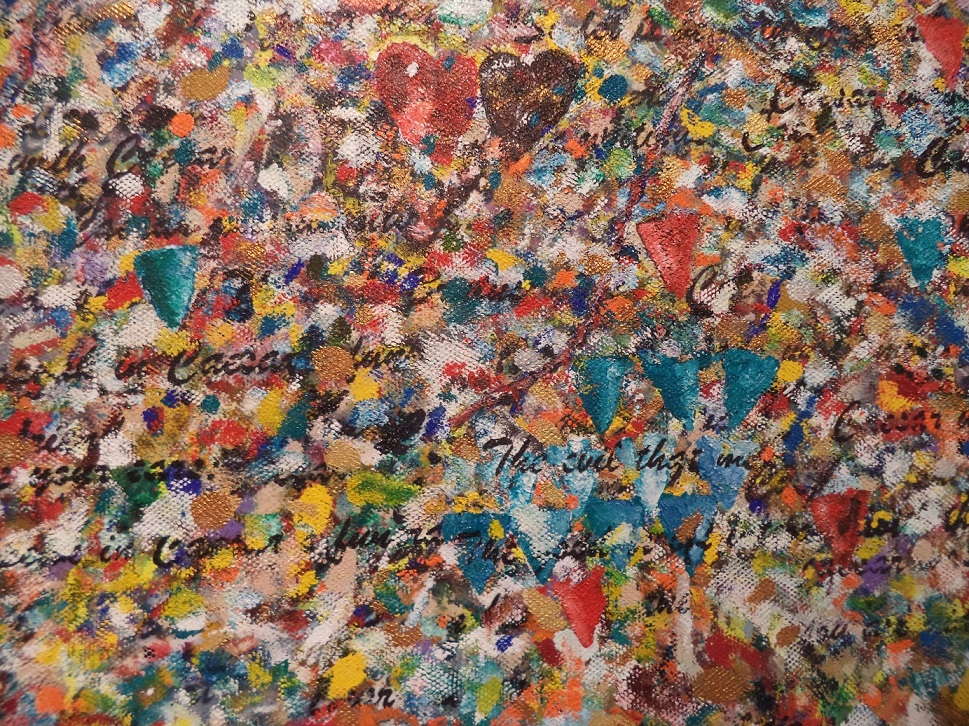 In Venice, the artist Oliver Benoit exhibited a picture in acrylic on canvas that is called Whipping the mind. Aesthetically, we perceive that the garish mask of the Carnival went “to the shredder”. In the Grenadian ritual, we imagine that the “whip” of the dance functions, to neutralize the corporal punishment, done by the pro-slavery colonists. In accordance with the abstract expressionism, it happens that the passionateness “inflames” the opacity of the mind. Perhaps the only figure able to withstand “the shredding” is about the case of a heart. The shore with the words in cursive is “overwhelmed” by the lyric synapses, having a sandiness which shines through, from the oneirism of the shells, coloured by means of the desire. The figure of the heart would confer a dance to the “cumbersome” figure of the cone, for a cold tornado.