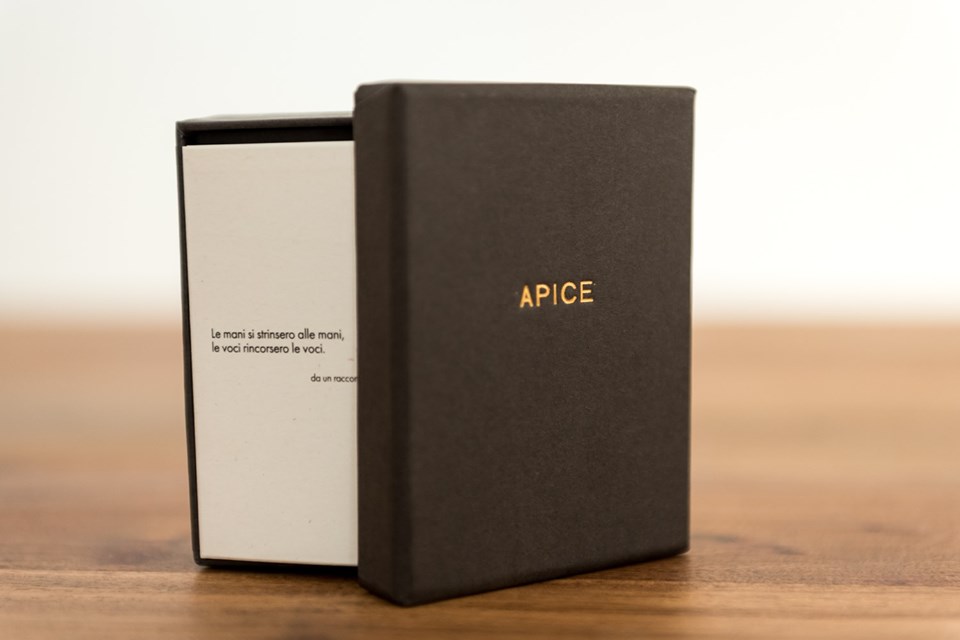 E se la memoria non inganna, ma connette e crea nuovi tessuti e legami, si può portare con sè, un piccolo segmento di Apice; una scatolina realizzata a mano da Legatoria Artigiana Napoli con incisione a caldo in bronzo e oro fino, in edizione limitata, contenente una piccola raccolta delle immagini prodotte.