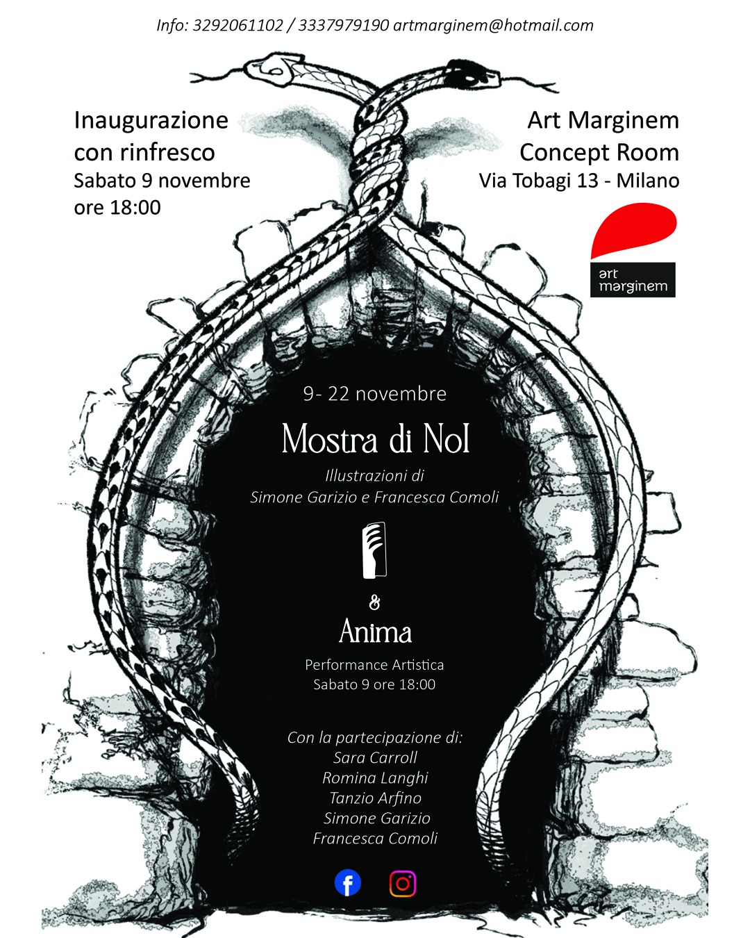 Il 9 novembre alle ore 18:00 ad Art Marginem Concept Room in via Tobagi 13 Milano , sarà inaugurata la mostra “NoI” illustrazioni di Simone Garizio e Francesca Comoli, attraverso la performance artistica “ANIMA” in cui recitazione, musica, danza e pittura interagiranno in un viaggio alla ricerca del Sé. Per concludere lo spettacolo ci sarà un piccolo rinfresco.