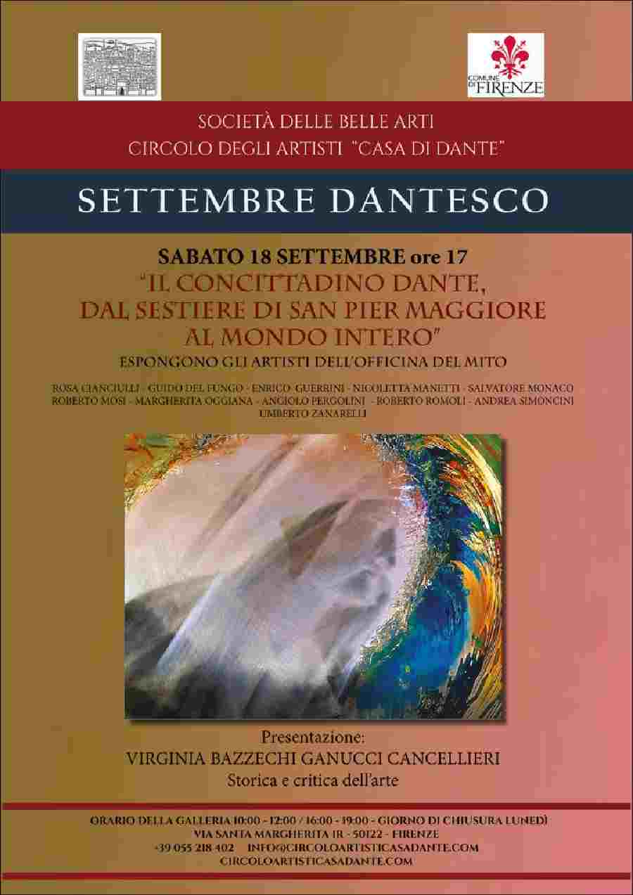 L’inaugurazione della mostra “Il concittadino Dante, dal Sestriere di San Piero Maggiore al mondo intero” avrà luogo Sabato 18 settembre 2021 alle ore 17.00 presso la Società delle Belle Arti- Circolo degli Artisti “Casa di Dante”, in via Santa Margherita n.1/r, Firenze. La mostra sarà presentata dalla storica e critica d’arte Virginia Bazzechi Ganucci Cancellieri.