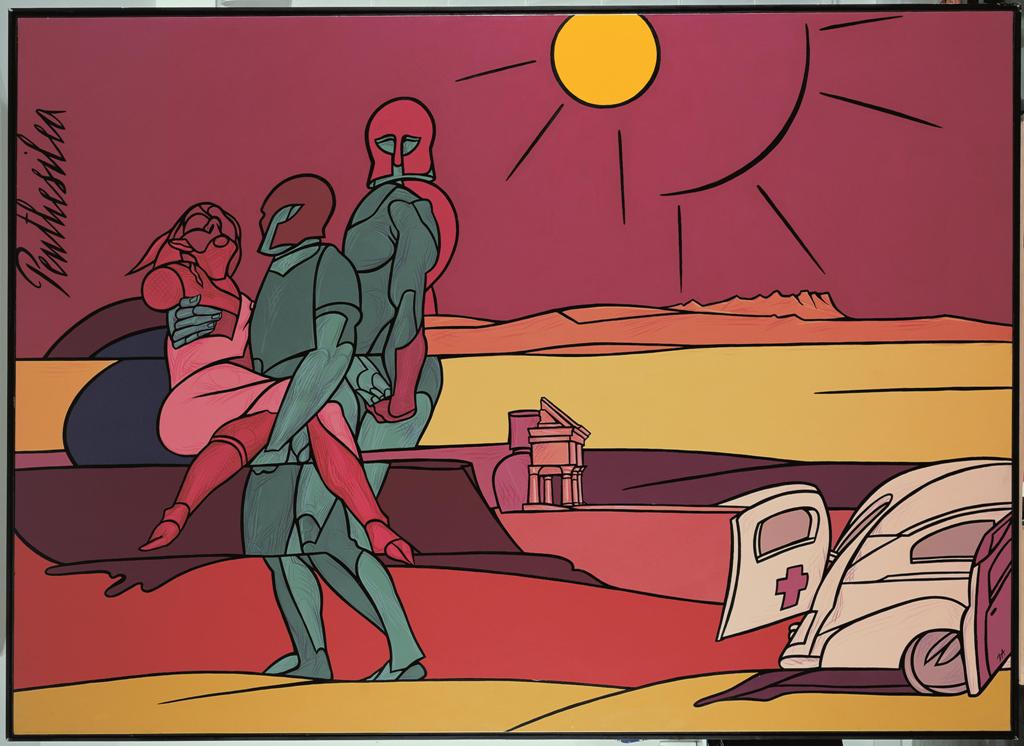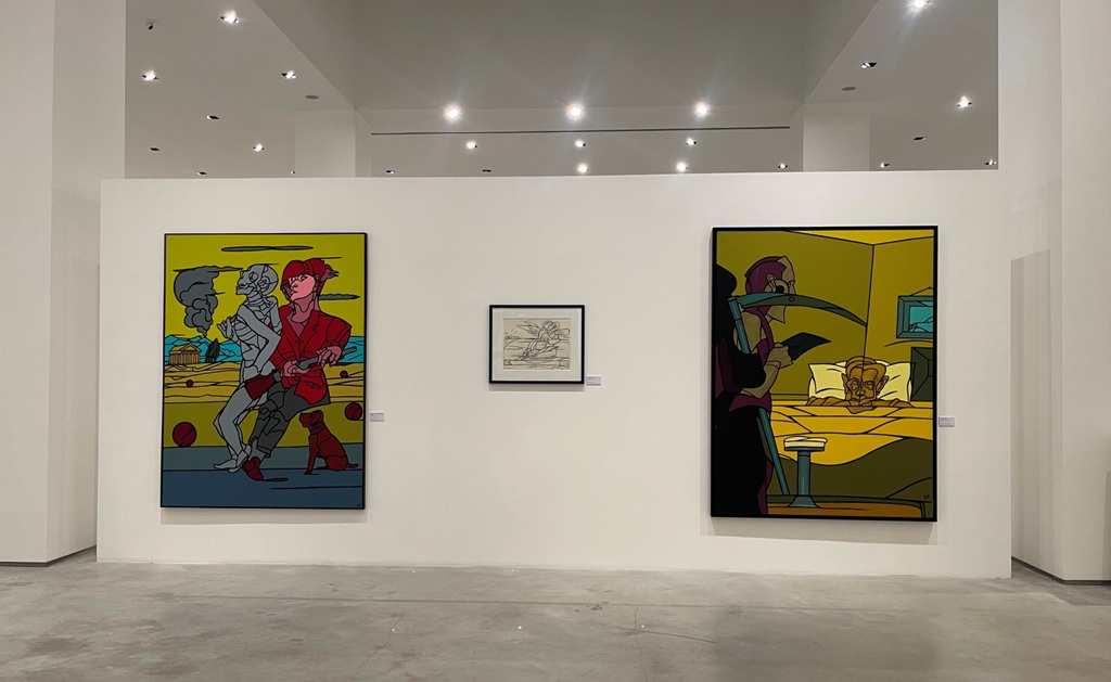 Disegno e colore si intrecciano in un linguaggio capace di rivelare l’universo simbolico di Adami, dove l’ossimoro tra sacro e profano si scioglie nella ricerca di una verità formale e di una narrazione dell’esistenza.