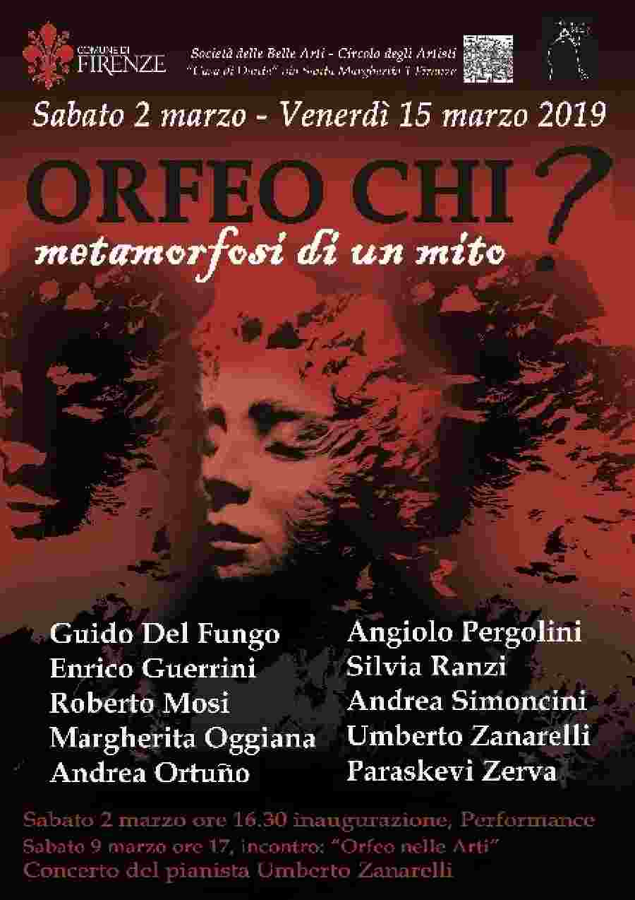L’inaugurazione della mostra “Orfeo Chi? Metamorfosi di un mito” avrà luogo Sabato 2 Marzo 2019 alle ore 16.30 presso la Società delle Belle Arti- Circolo degli Artisti “Casa di Dante”, in via Santa Margherita n.1/r, Firenze. La mostra sarà presentata dalla storica e critica d’arte Virginia Bazzechi Ganucci Cancellieri.