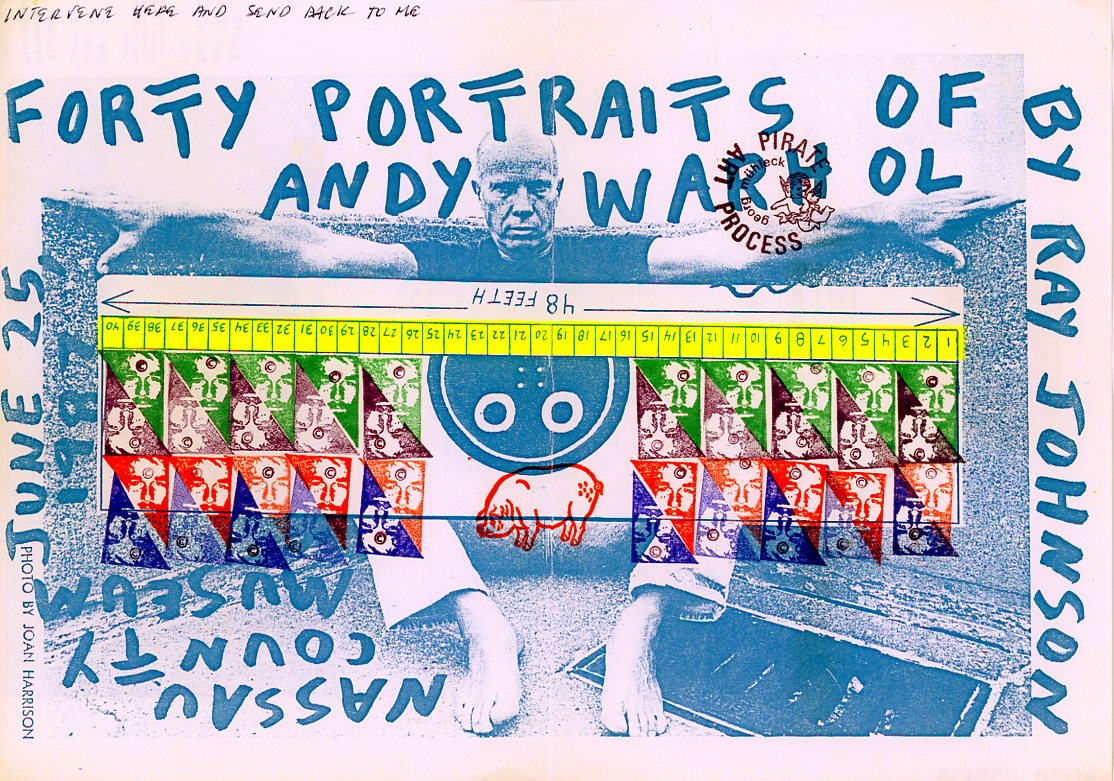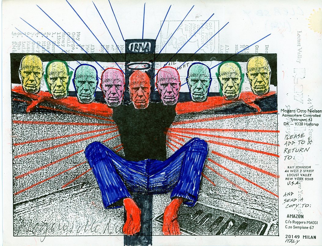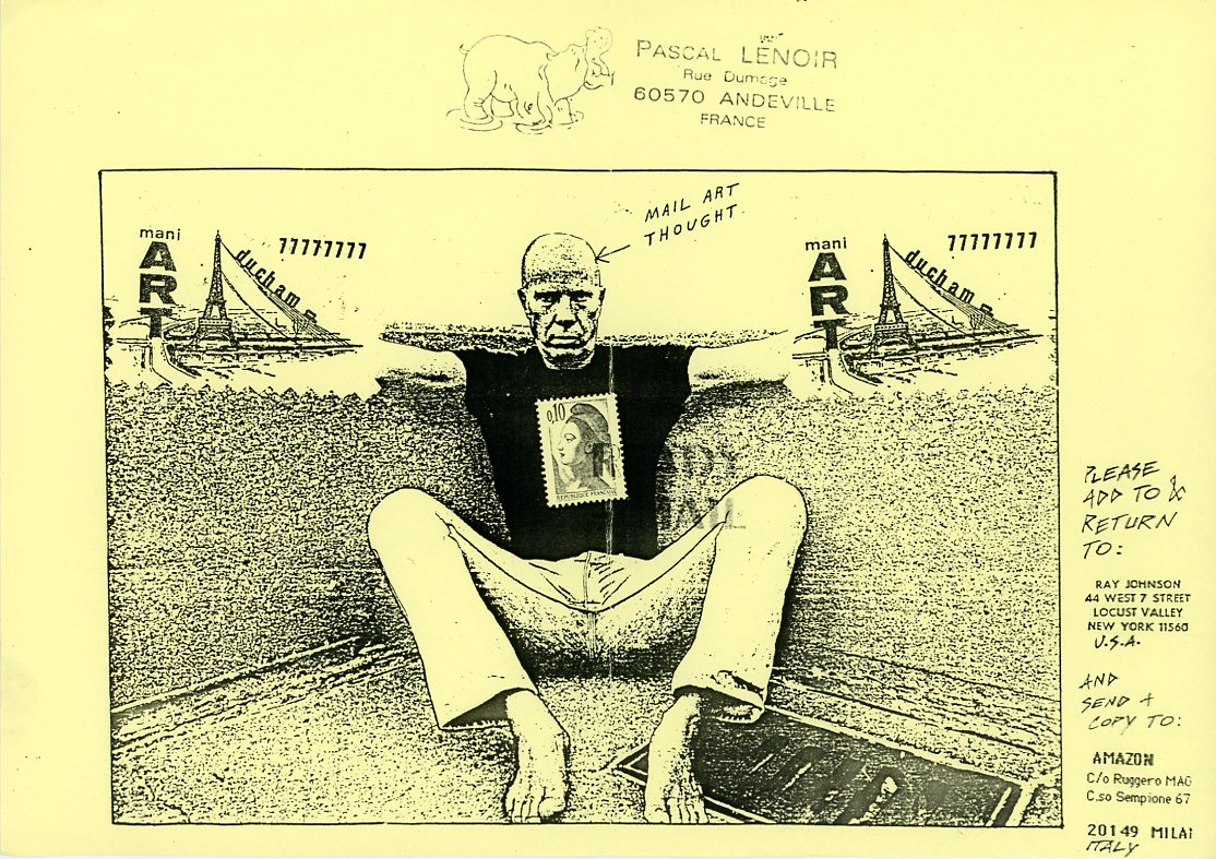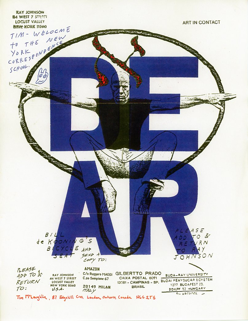 Ray Johnson, nel 1962, fondò la New York Correspondance School of Art, una sorta di scuola d’arte per corrispondenza nella quale gli elaborati grafici con l’inserimento di timbri e collage venivano per la prima volta spediti per posta a conoscenti e persino ignari destinatari, dando completa autonomia alla comunicazione e rendendo questo nuovo modo di espressione totalmente libero, al di fuori di qualsiasi schema imposto e prefissato dal potere culturale e di conseguenza dal mercato ufficiale dell’arte.