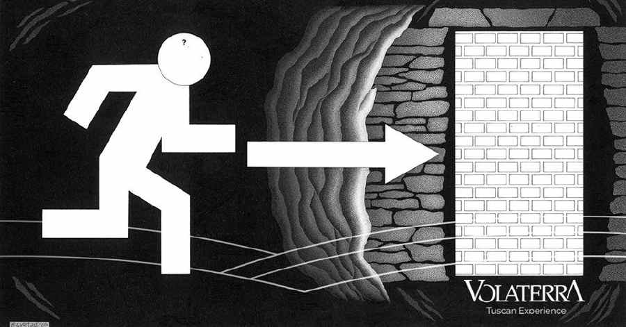 La fiducia nella fuga - sarcastico e drammatico il titolo dei lavori: “Vie d’uscita” - si compie su un tessuto di sintesi proprio dei contenuti della Trappola successiva. Avvolge il protagonista anonimo, ideale e stilizzato - come da cartelli urbani - vuoto nei suoi connotati rispetto alla ridondanza, l’artificio e la ricercatezza del segno che tesse lo sfondo in cui - apparentemente - si muove.