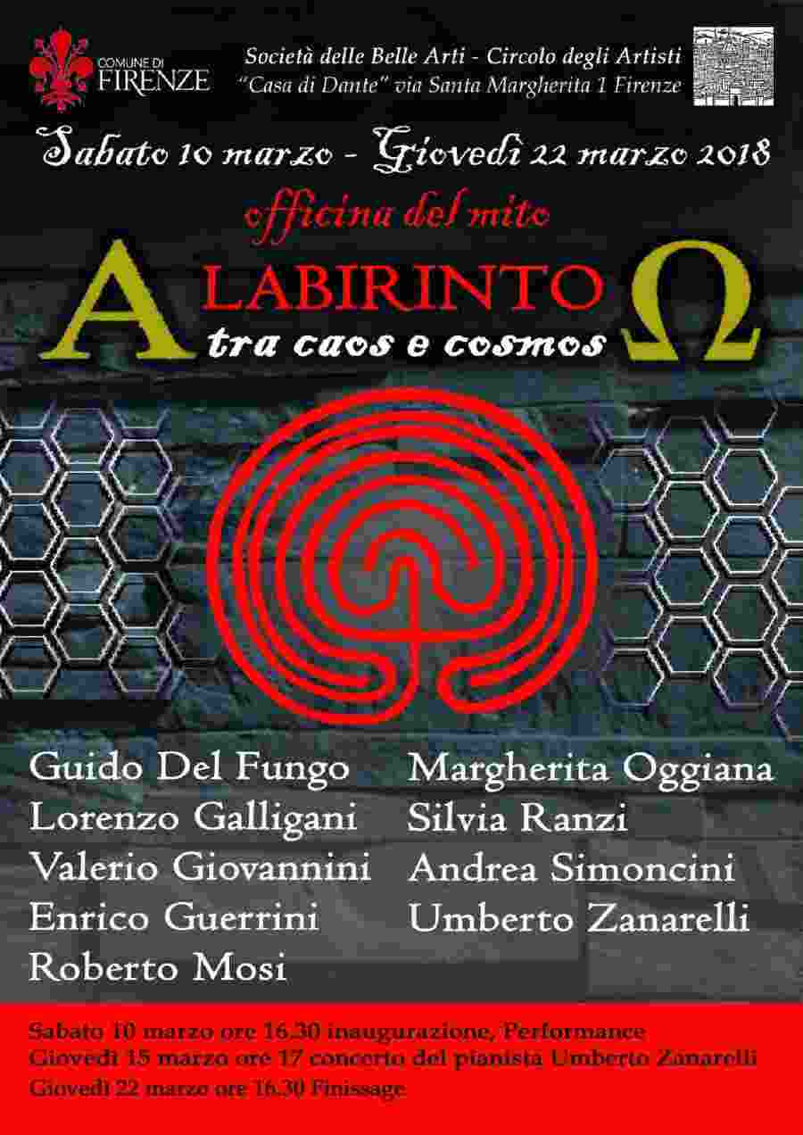 L’inaugurazione della mostra “A- Labirinto tra caos e cosmos -Ω” avrà luogo Sabato 10 Marzo 2018 alle ore 16.30 presso la Società delle Belle Arti- Circolo degli Artisti “Casa di Dante”, in via Santa Margherita n.1/r, Firenze. La mostra sarà presentata dalla critica e storica dell’arte Virginia Bazzechi Ganucci Cancellieri e in tale occasione si terrà anche una Performance.