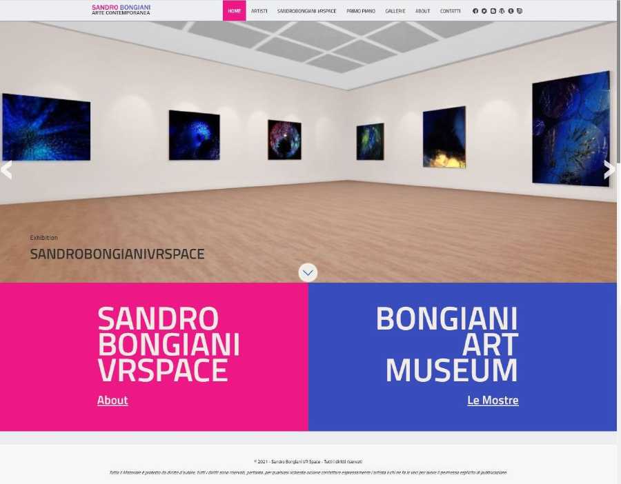 SANDRO BONGIANI VRSPACE è la nuova realtà virtuale di arte contemporanea creata nel 2021 da Sandro Bongiani Arte Contemporanea. Uno spazio indipendente no-profit impegnato nel sostegno e nella promozione dell’arte contemporanea. L’attuale interfaccia presenta la nuova piattaforma con uno spazio interattivo e veloce capace di rispondere alle esigenze concrete degli utenti del web e un pubblico sempre più vasto e desideroso di conoscere l’arte contemporanea in modo più diretto e “democratico”. Dal 2009 abbiamo realizzato progetti internazionali, mostre collettive, personali e retrospettive presentando diversi e interessanti artisti caratterizzati da una propria specifica visione personale dell’arte, cercando così, di dare il nostro reale apporto alla scena artistica culturale internazionale. VRSPACE non è una tradizionale galleria d’arte o una semplice presentazione web di un book fotografico di opere d’arte destinate alla vendita on-line, ma uno spazio virtuale innovativo e altamente efficiente che usa le strategie consolidate delle gallerie reali del sistema ufficiale dell’arte in modo nuovo e intelligente. Specializzato nella documentazione dell’ attività di art consulting e di diffusione dell’arte contemporanea. Di fatto, l’attività della Sandro Bongiani Arte Contemporanea risulta capace di rispondere alle esigenze concrete degli utenti del web e far conoscere l’arte contemporanea ad un pubblico sempre più vasto e interessato. Queste tre "piattaforme culturali" visibili in tempo reale, risultano per continuità le più importanti gallerie virtuali interattive "no profit” al mondo che operano sistematicamente on line in ambito artistico con un serio programma continuativo di proposte culturali e con uno spazio sempre aperto, non ha una superficie fisica ma solo virtuale, si trova idealmente a Salerno ed è visibile in punta di mouse 24 ore su 24 in tutto il mondo.