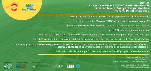 11 Festival Internazionale dei Depuratori: Via a 2 giorni di arte e scienza nel cuore di Milano