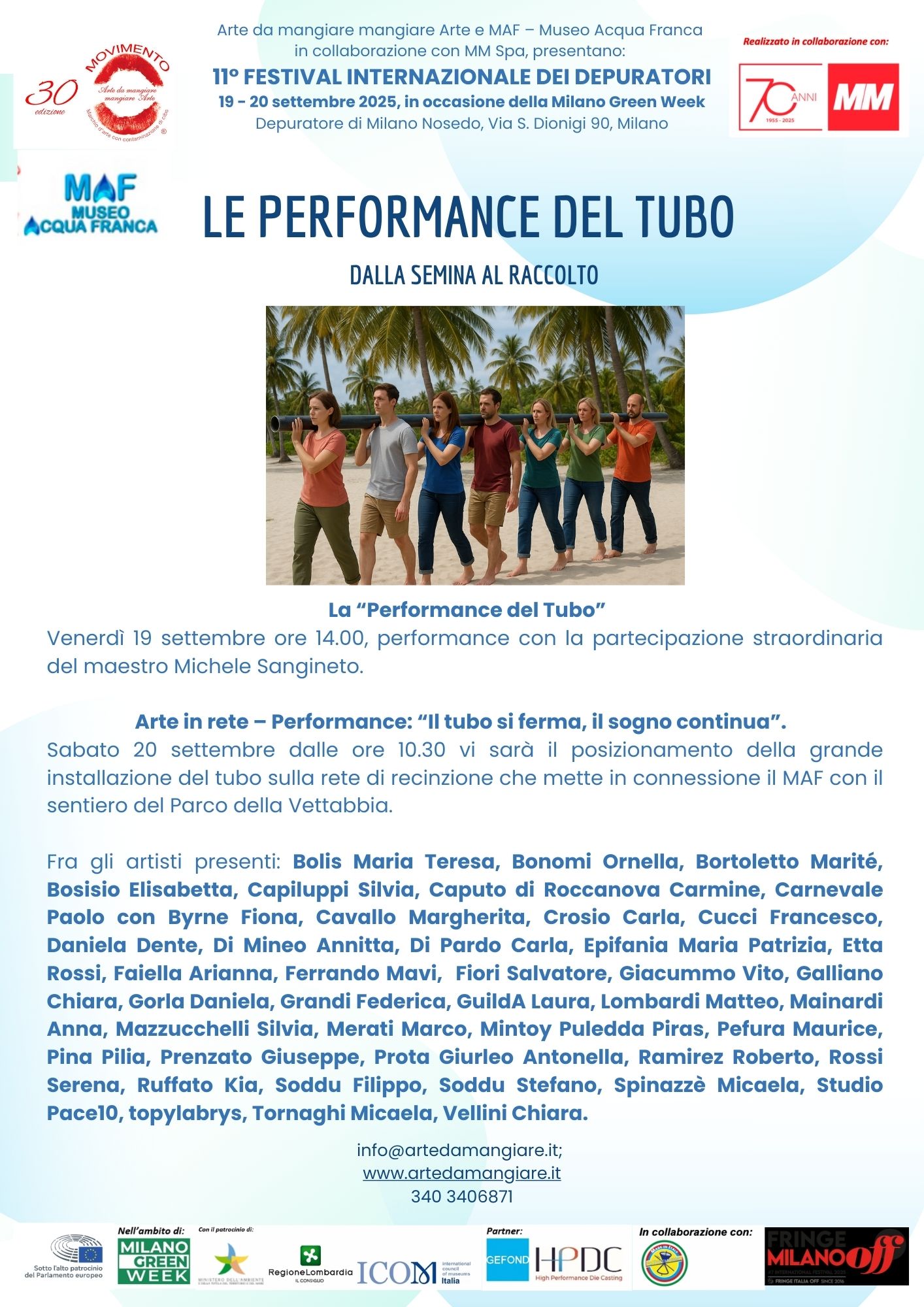 Un gesto collettivo, un attraversamento simbolico, una processione laica che parte dalla palazzina delle conferenze e si dirige verso il cuore pulsante del MAF, tra installazioni, acque, paesaggi di rigenerazione. 40 artisti danno corpo e forza a un'azione condivisa: trasportare un grande manufatto d’arte lungo 80 metri, una scultura itinerante, viva, che si muove nello spazio come un fiume umano. Vieni anche tu a prender parte alla performance, reggendo il grande tubo dell’arte (partecipazione adatta anche ai bambini).