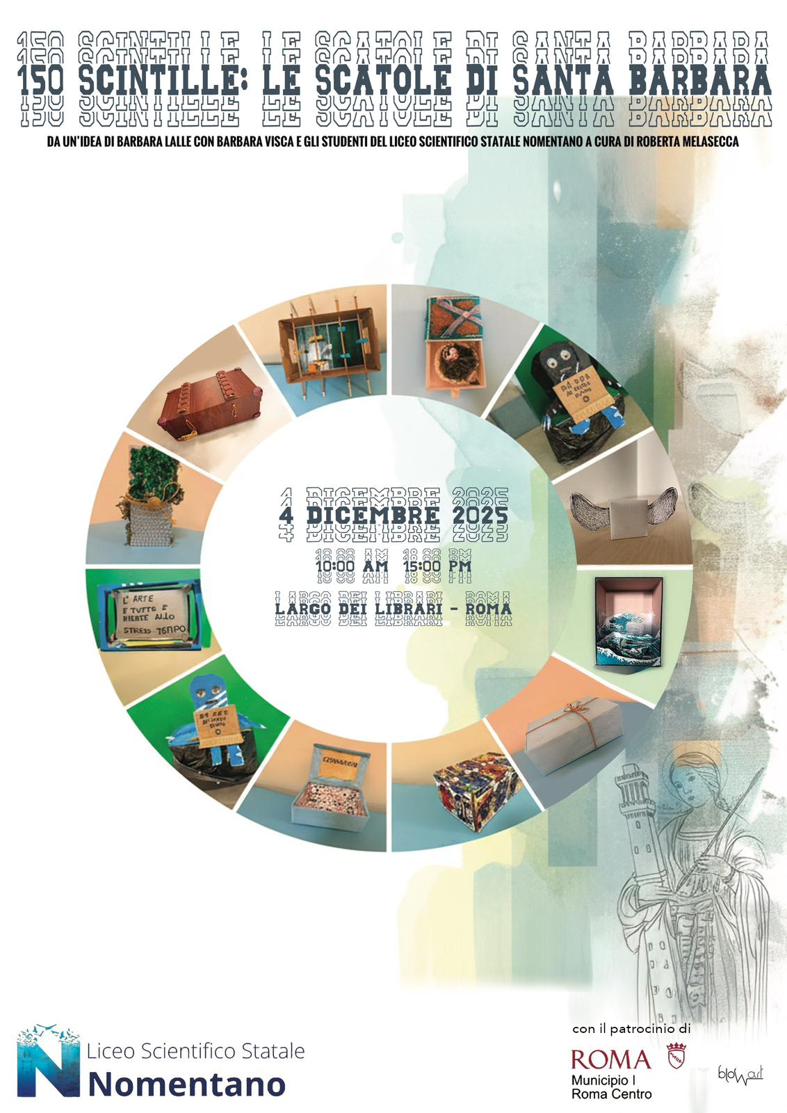 Il giorno 4 dicembre 2025 dalle 10.00 alle 15.00, nello spazio antistante la Chiesa di Santa Barbara dei Librari, Barbara Lalle, Barbara Visca, Roberta Melasecca e il Liceo Scientifico Statale Nomentano presentano 150 scintille: le Scatole di Santa Barbara. Il progetto nasce da un’idea di Barbara Lalle, artista e insegnante, dal sodalizio artistico di lunga data con un’altra artista ed insegnante, Barbara Visca e dal desiderio di unire creatività, comunità ed educazione, aprendo un dialogo tra arte contemporanea, memoria e valori universali, generando così connessioni tra mondo dell’arte e mondo della scuola e giovanile.