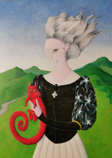 Il personaggio femminile al centro della tela indossa un abito che richiama alla memoria lo stile delle nobili dame del Cinquecento, e questa impressione sembra confermata anche dall’impostazione delle figure che ricorda la tradizione della ritrattistica rinascimentale, prima fra tutte l’opera “Dama con l’ermellino” di Leonardo da Vinci. Se da un lato tutti questi aspetti rammentano influenze riconducibili a quel periodo, osservando il dipinto ci accorgiamo che mentre le similitudini formali associano questo universo sconosciuto a un passato che ci appartiene, i personaggi raffigurati non sono altrettanto propensi a rientrare nel paradigma dolce e raffinato dell’arte cinquecentesca.