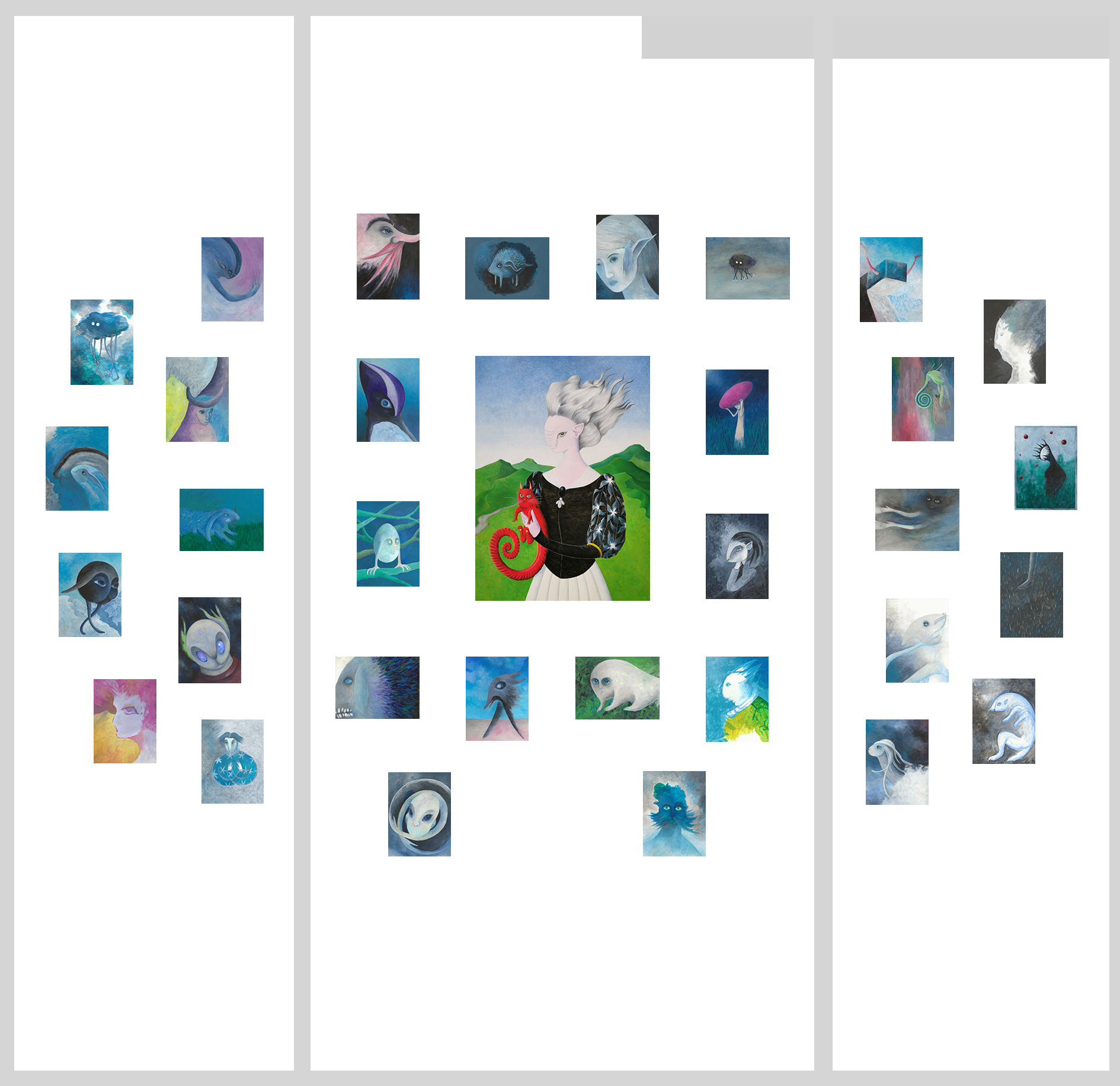 In questo momento Unlikely Landscapes è composto da 75 opere con caratteristiche e percorsi tematici differenti: Animals, Big Boobs, Fangs, Landscapes, Shining Lake, Structures, Tornados, Abstract caramelized.
