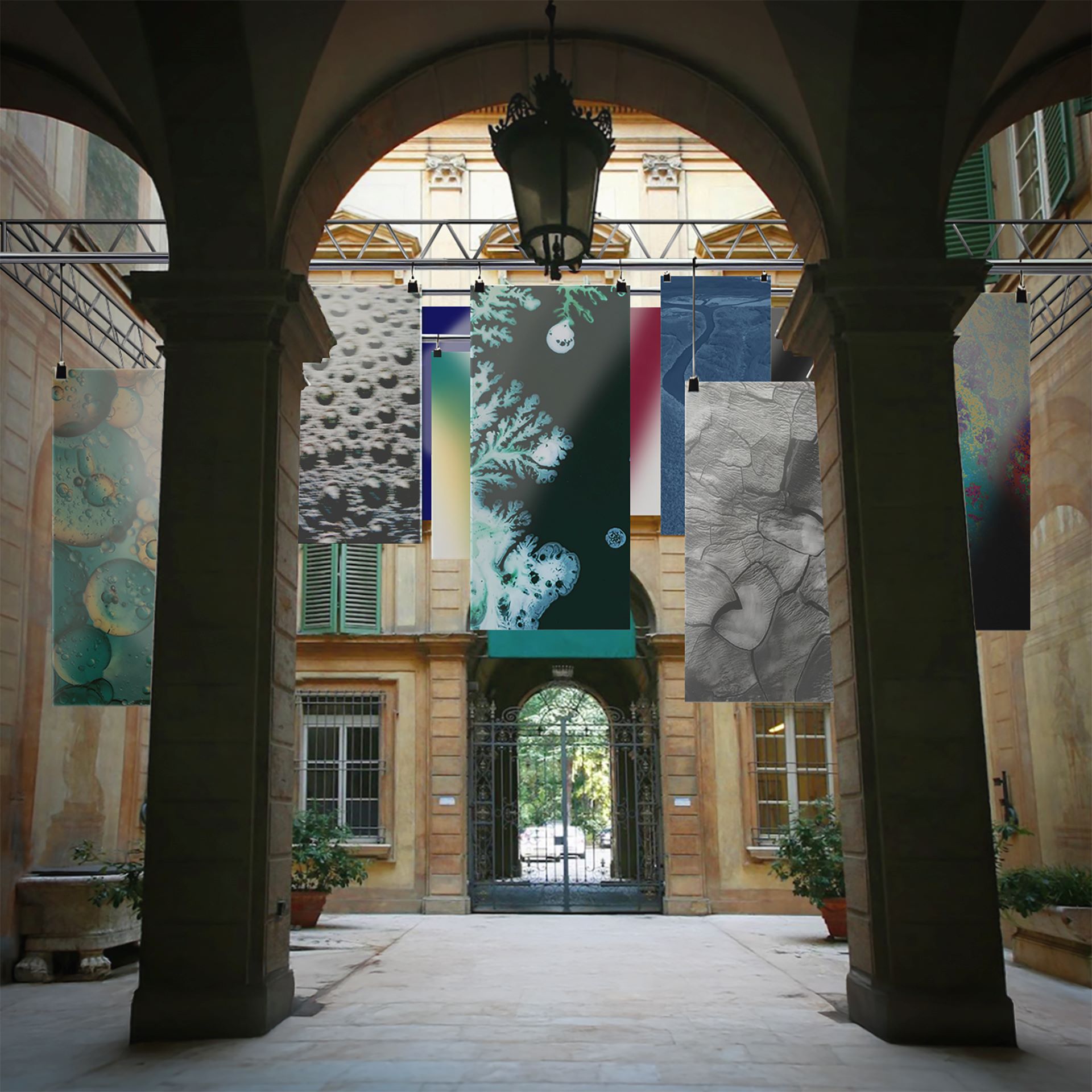 Le opere affrontano con tecniche diverse i temi dell’acqua come risorsa vitale per i territori, dell’ambiente da proteggere e da valorizzare, della biodiversità e delle tecnologie più evolute a servizio delle attività antropocentriche. E indagano anche i luoghi e le architetture deputate alla gestione delle acque, a partire dagli impianti storici di Saiarino e Vallesanta. L’allestimento trasforma il cortile in una soglia narrativa: le opere sono sospese, fluttuano come stendardi moderni tra i trompe-l’oeil settecenteschi che decorano le pareti. Ancorate alla monumentalità del passato, invitano il visitatore a rivolgere lo sguardo al futuro, puntando gli occhi all’insù.