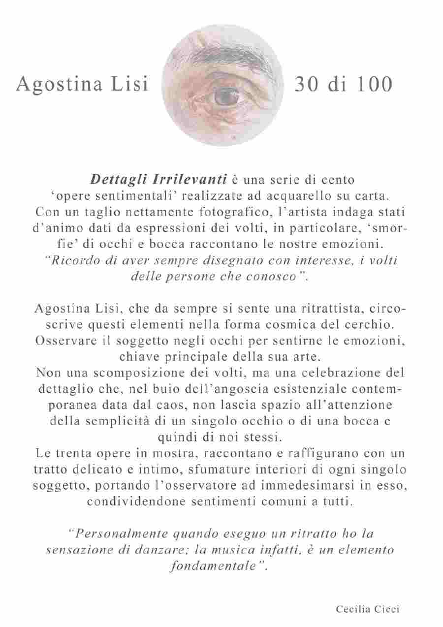 Le opere in mostra sono parte di un progetto composto da 100 acquerelli formato 12x12 cm, che presentano un rigoroso taglio fotografico volto a catturare l’attimo. La serie di piccole opere, dal titolo “Dettagli irrilevanti” vuole essere una provocazione: i diversi particolari del viso sono il manifesto delle nostre emozioni, espressioni e stati d’animo; ciononostante, la routine della vita e l’uso smodato della tecnologia allontanano lo spettatore dal senso di umanità, relegando la diversità e l’unicità dei tratti umani a dettagli insignificanti.