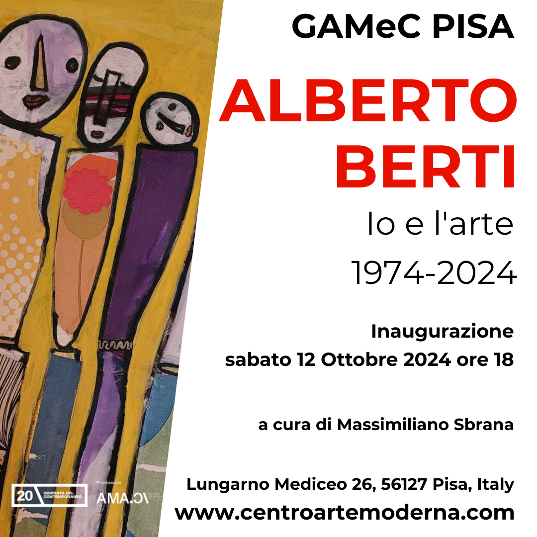 Si inaugurerà Sabato 12 Ottobre 2024 alle ore 18,00 presso gli spazi espositivi della Galleria d'Arte Moderna e Contemporanea CentroArteModerna di Pisa, a cura di Massimiliano Sbrana, sul Lungarno Mediceo al n. 26, la mostra "Io e l'Arte / 1974-2024" del noto pittore pisano Alberto Berti, inserita nella 20 edizione della GIORNATA DEL CONTEMPORANEO promossa a livello nazionale da AMACI ( Associazione dei Musei d’Arte Contemporanea Italiani).