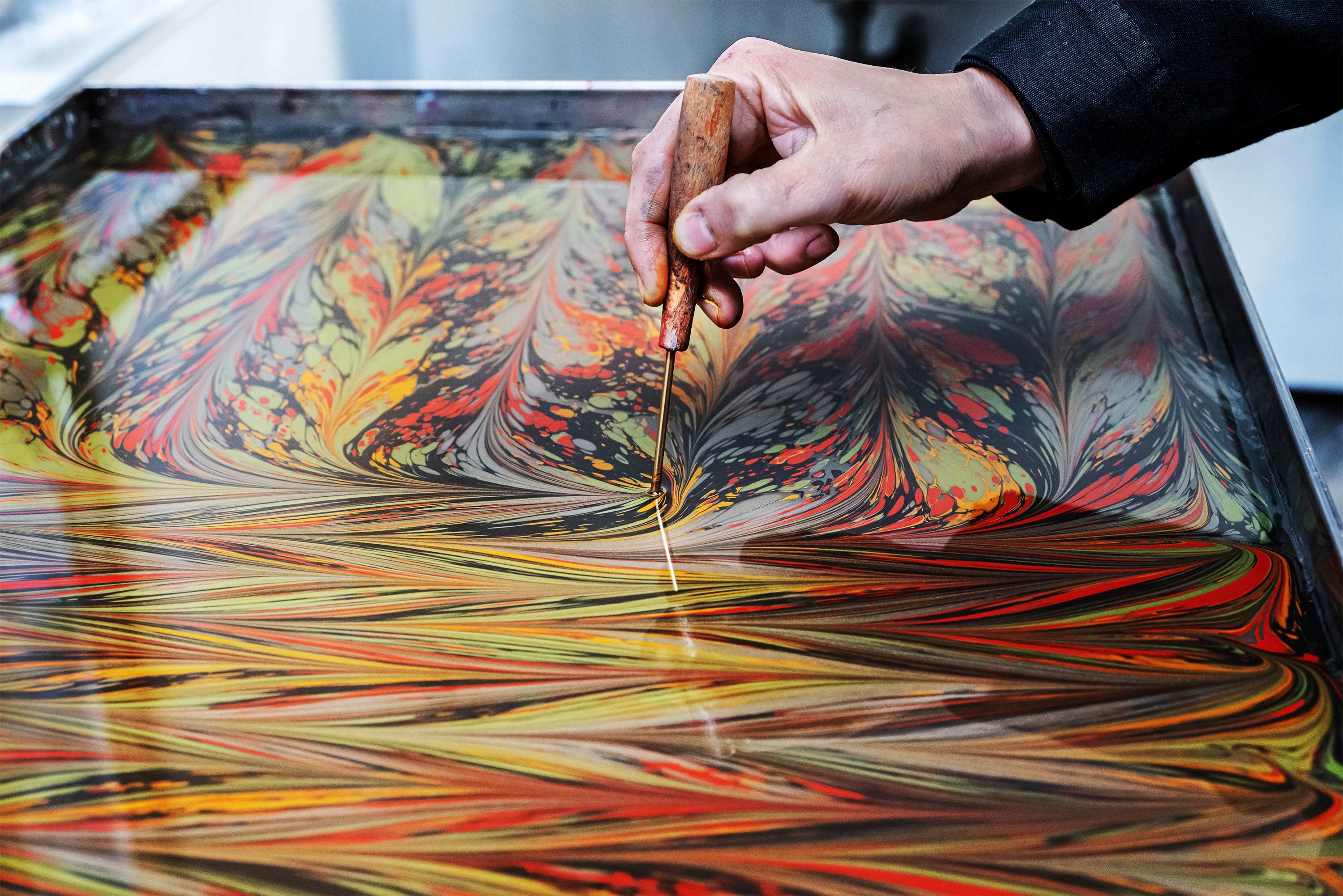 Alberto Valese, nato a Venezia nel 1951, si è dedicato per più di quarant’anni alla legatoria ed in particolare allo studio della tecnica della marmorizzazione che inizia da autodidatta, dando vita ad una serie di opere uniche nel loro genere che lo hanno reso noto in tutto il mondo. L’esposizione vuole essere, oltre che un omaggio al maestro veneziano attraverso una selezione ad ampio spettro fra le tipologie di carte da lui prodotte, anche un’occasione per far comprendere, attraverso dei supporti video, il modus operandi di Valese ed il suo immaginario. Carte marmorizzate, suminagashi, ebrù, sono tutte tecniche che convogliano nella realizzazione delle decorazioni, dal floreale all’astratto, di libri pregiati, quaderni, scatole, tessuti e oggetti di ogni tipo. In mostra vi saranno non solo carte marmorizzate ed ebrù, ma anche vere e proprie opere d’arte come le pietre “non infossibili”, finti fossili realizzati fondendo l’ebrù con la modellazione della carta pesta, le piastre oscillanti che assomigliano a piccoli universi in miniatura sospesi da delicate strutture di ferro, i mobile, d’ispirazione calderiana, e ancora sculture a forma di teste ed oggetti di design.