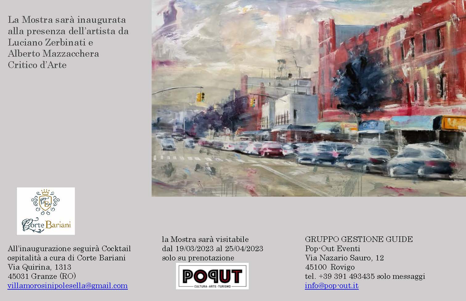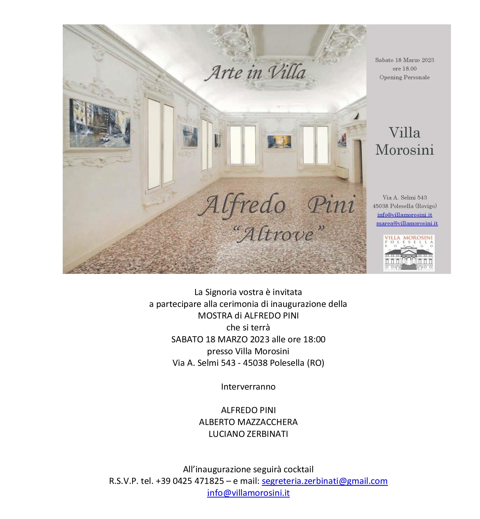Il candore delle pareti e dei rilievi seicenteschi dell’armoniosa Sala degli Stucchi della villa del doge Morosini, eretta sulla riva veneta del Po con la composta e pulita architettura di Vicenzo Scamozzi, accentua la narrazione racchiusa nei panorami metropolitani, selezionati da Alfredo Pini (1958) per questa esposizione.