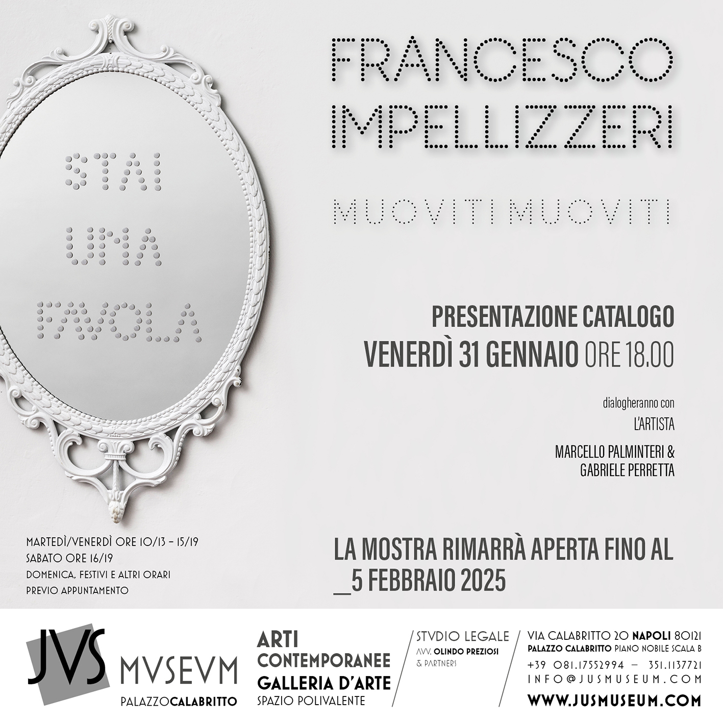 NAPOLI. Venerdì 31 gennaio, alle ore 18.00, presso lo JUS Museum di Napoli (Palazzo Calabritto, Via Calabritto, 20, piano nobile, scala B) verrà presentato il catalogo della mostra “Francesco Impellizzeri. Muoviti Muoviti” a cura di Marcello Palminteri con un saggio critico di Gabriele Perretta.