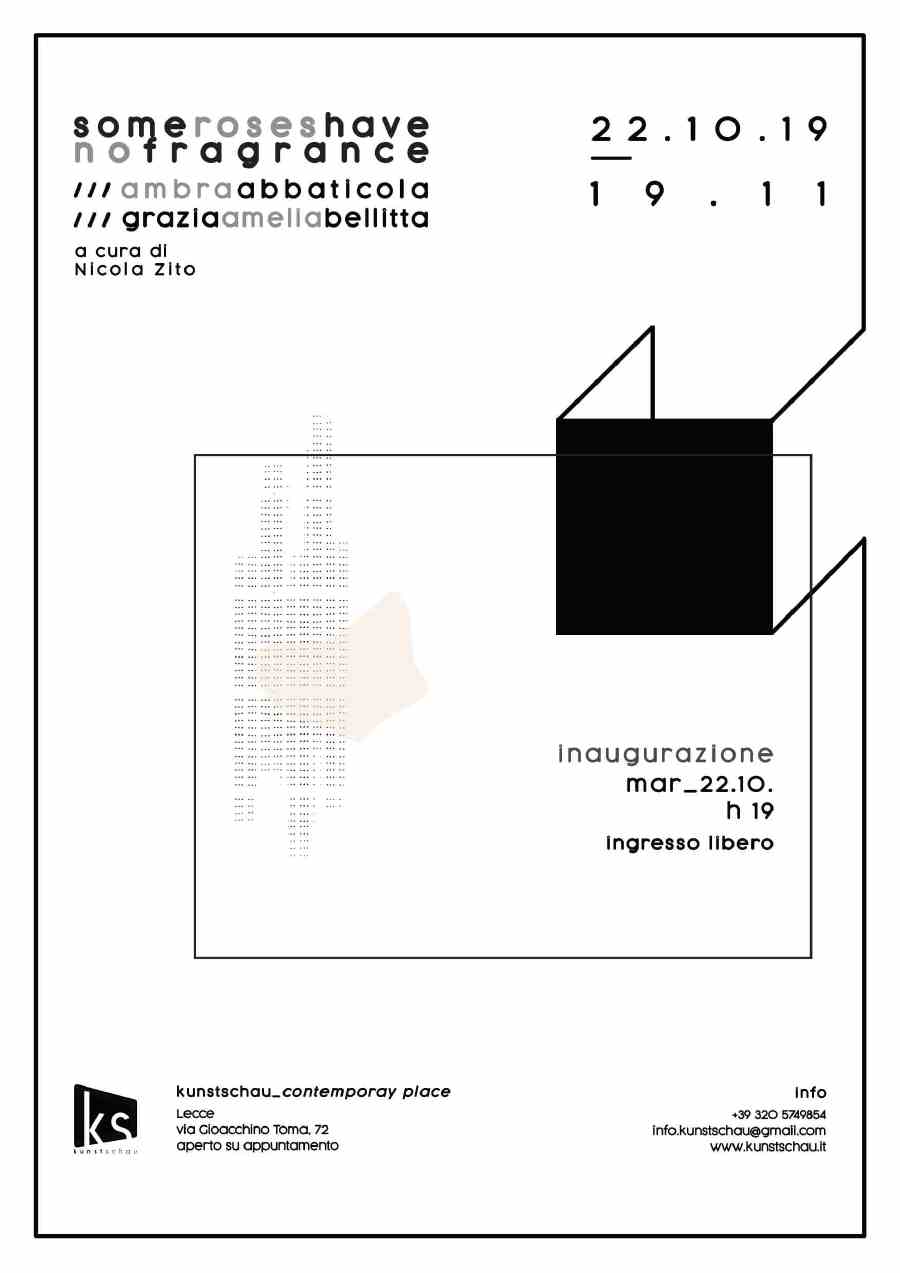 Martedì 22 ottobre 2019 alle ore 19.00, Kunstschau_Contemporary Place a Lecce in via Gioacchino Toma 72, inaugura la mostra Some roses have no fragrance con le opere di Ambra Abbaticola e Grazia Amelia Bellitta, a cura di Nicola Zito.