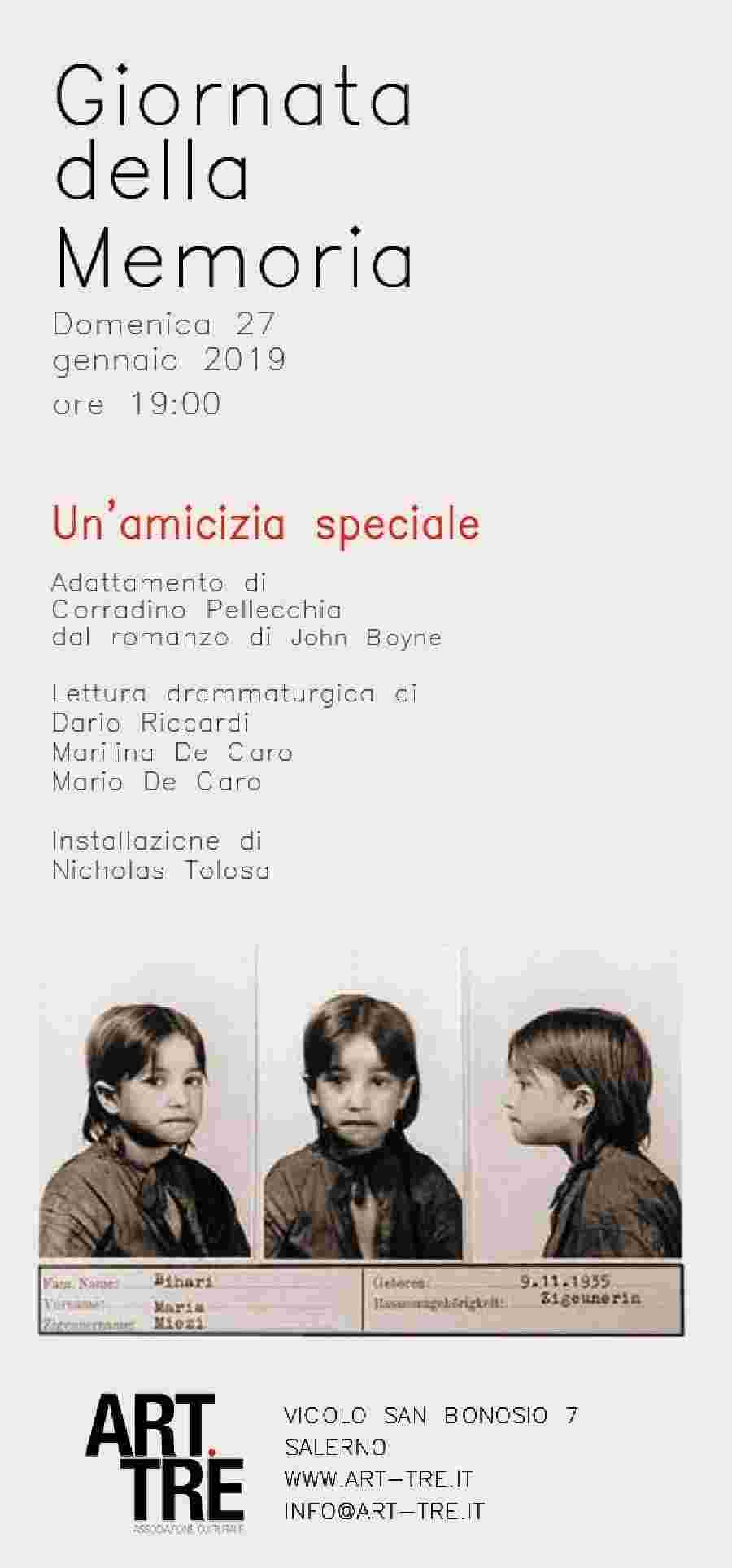 L’adattamento teatrale affronta il tema dell’Olocausto, filtrato attraverso lo sguardo innocente di un ragazzo, ed apre uno spazio di riflessione sul pericolo che quegli stessi orrori possano ripetersi anche oggi. Perché la memoria è il miglior antidoto a quei rigurgiti di intolleranza, violenza, egoismo, mancanza di rispetto per l’altro, abdicazione del senso morale, che sembrano di nuovo albergare nella nostra società. Quinta è l’installazione dell’artista ebolitano Nicholas Tolosa, lo sguardo da sempre rivolto agli ultimi: sulle pareti di Art.Tre il ciclo di opere dedicato ai bambini vittime della Shoah a simbolo universale dell’infanzia violata e rubata.