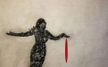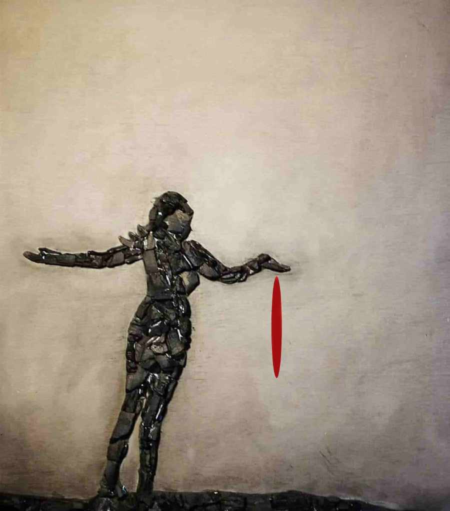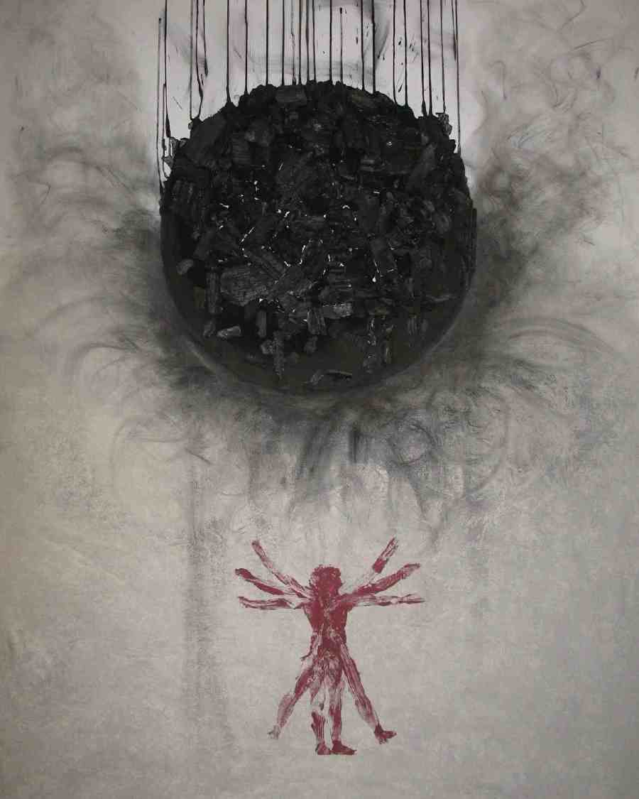 Ancora una volta il carbone, materia principe dell’artista, questa volta macchiato di rosso, colore da qualche anno legato ormai al grido del mondo femminile, è assunto a simbolo del degrado dell’animo ed è parimenti un richiamo alla volontà di preservare ciò che appartiene all’essenza della vita stessa. In questo contesto la fragilità delicata di una donna trova corrispondenza nella stessa fragilità del nostro pianeta.