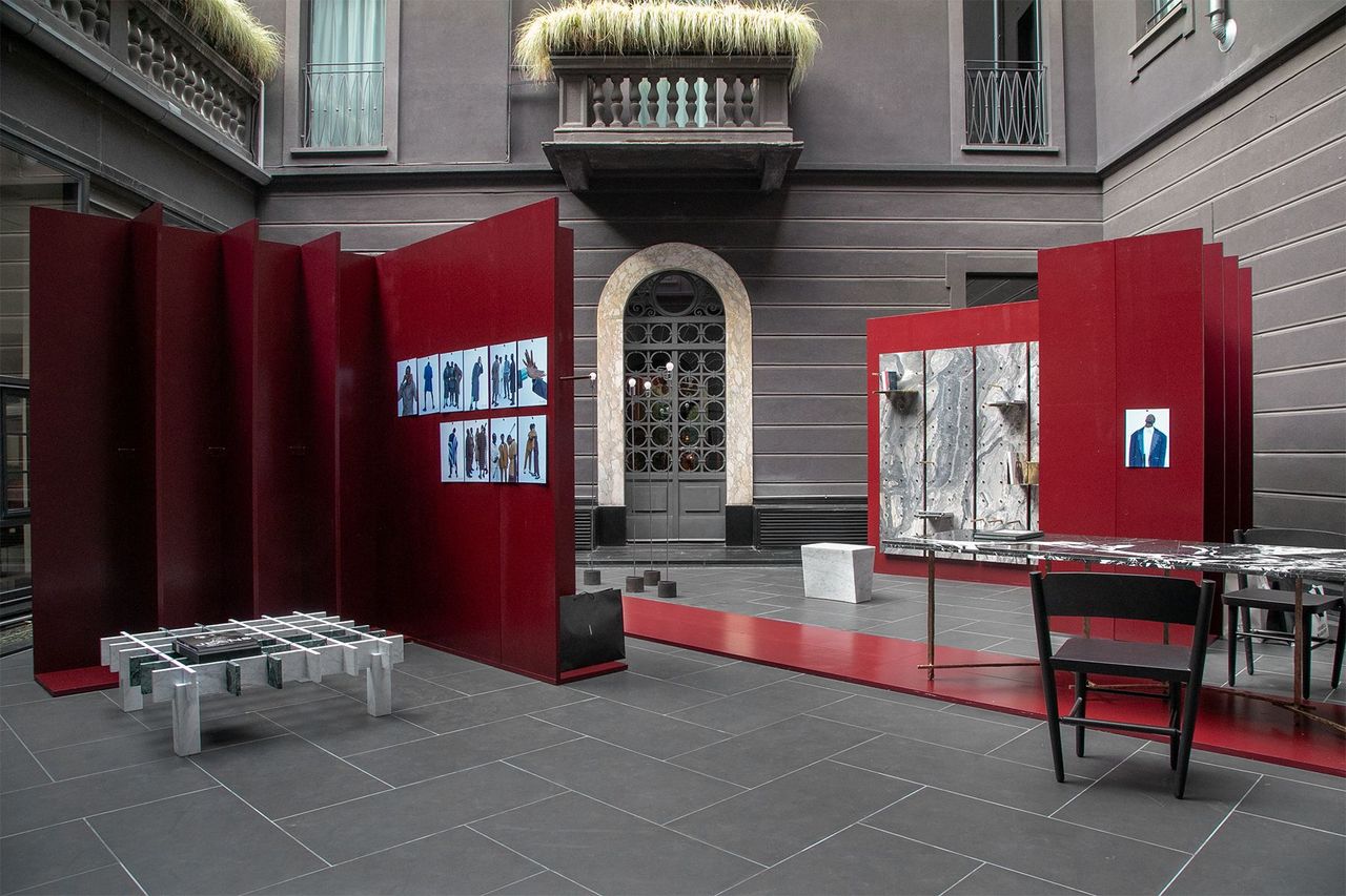 Racconta, attraverso il design, la visione di chi scrive il gusto, definisce il lessico e orienta il linguaggio della moda. È ANDRÉ’S OFFICE, installazione temporanea firmata da Spazio RT – design gallery milanese – nella corte nera di Senato Hotel Milano, in occasione della Milano Fashion Week Men’s 2025. Dal 13 al 24 giugno, lo spazio immagina l’ufficio ideale di un fashion editor, ispirandosi alla figura carismatica e visionaria di André Leon Talley, storico direttore moda di Vogue. Il percorso espositivo si sviluppa attorno a un impianto architettonico essenziale, al contempo intimo e permeabile: quinte in legno, tinte di un rosso profondo, disegnano pareti destrutturate che lasciano filtrare la luce e lo sguardo. Emergono molteplici punti di vista che invitano a scoprire il mondo di chi modella l’immaginario collettivo. Ogni elemento, scelto con rigore, traduce in forma la visione dell’editor. L’“ufficio” diventa un dispositivo narrativo: luogo di lavoro, di riflessione e fonte di ispirazione che sollecita un’esperienza di contemplazione critica, oltre il semplice colpo d’occhio estetico. L’allestimento affianca pezzi storici del design italiano e arredi della collezione Spazio RT Contemporary, in una ricercata tensione tra presente e passato, attualità del progetto e citazione colta. Da un lato, il tavolo console disegnato da Spazio RT, con piano in marmo Gran Noir Antique su gambe in bronzo fuso, si impone come punto di ancoraggio visivo. La seduta in abbinamento è evocata dallo sgabello-scultura in marmo di Carrara, firmato da Sergio Calatroni per la galleria milanese. Alle sue spalle, la libreria Pioli (design Spazio RT) si erge come un monolite, composta da pannelli ricavati da un’unica lastra di marmo Arabescato Orobico, dotata di ripiani mobili sostenuti da pioli in ottone lucido. Al centro, illumina lo spazio una composizione filiforme di cinque lampade da terra modello Notti, disegnato negli anni Settanta da Gigi e Pepe Tanzi per Dalca e caratterizzato dal sottile stelo in acciaio cromato e dalla base in ghisa. Accanto, il trittico di tavolini Djuna di Kazuhide Takahama, progettati per Gavina all’inizio degli anni Ottanta, bilancia la matericità del Gran Noir Antique con la leggerezza del basamento in acciaio cromato. Completa il percorso Jumbito, ultima novità di Spazio RT Contemporary: un tavolino basso realizzato con lastre di marmo Carrara e Verde Guatemala, sapientemente incastrate secondo un motivo che riecheggia il disegno del carabottino. Nato dal recupero degli sfridi di lavorazione, l’oggetto trasforma un materiale di scarto in un pezzo d’autore.