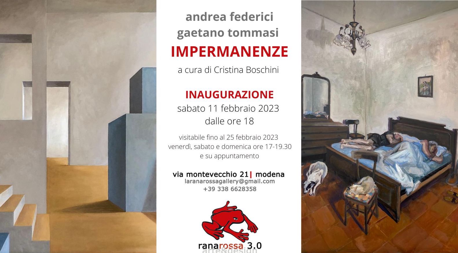 Si compenetrano i percorsi artistici di Gaetano Tommasi e Andrea Federici in questa bipersonale esposizione il cui titolo, 'Impermanenze', è già narrazione di una condizione contemporanea di precarietà, di provvisorietà. I due autori, che condividono l'espressione figurativa anche attraverso connessioni cromatiche, mettono in comune l'ascolto quotidiano silenzioso e solitario del circostante per mettere in luce una umanità che, racchiusa in vuote 'stanze di vita', lega alla propria anima alla difficoltà di rapporti che vadano oltre le convenzioni e i bisogni non necessari di cui ormai tutti noi siamo preda. Impermanenza è anche un tempo sospeso su una condizione di transitorietà. Così le stanze 'trascendenti' abitate da pochi oggetti di uso comune che ricorrono nelle opere di Federici, si popolano di una umanità, ritratta da Tommasi, consapevole della propria reale e dolorosa condizione, in un' autoriflessione palese, che è da sempre l'unico strumento di crescita personale.