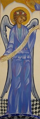 Per realizzare per esempio i suoi delicati e poetici angeli vestiti d’azzurro, che sembrano quasi muoversi ascoltando una musica celeste, la pittrice trae ispirazione da varie fonti, ideando un’accurata traduzione iconografica, per quanto riguarda l’atmosfera che li avvolge, tratta dal grande pittore rinascimentale Melozzo da Forlì; per il cromatismo, dagli angeli dal manto azzurro degli angeli raffigurati in un Vangelo inglese del ‘300 e, per altri aspetti, da un’icona diaconale appartenente alla grande famiglia russa degli Stroganov.