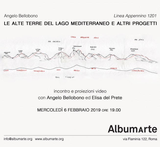 Mercoledì 6 febbraio 2019 alle ore 19.00 ad AlbumArte in via Flaminia 122 a Roma, il pubblico sarà coinvolto in una serata di dibattito e proiezioni video dal titolo Le alte terre del Lago Mediterraneo e altri progetti, con Angelo Bellobono ed Elisa Del Prete.